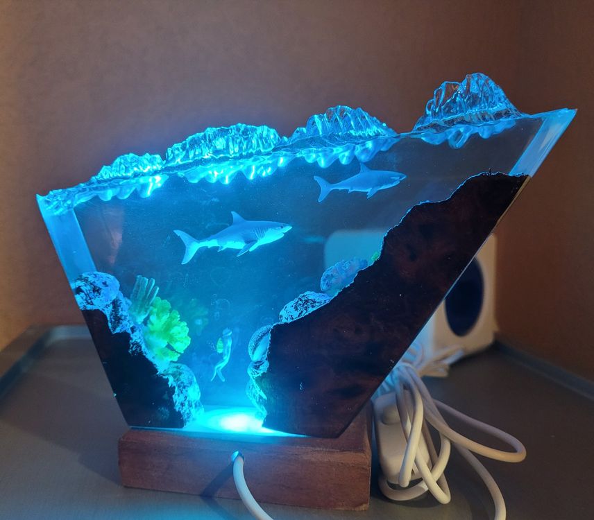 Tauche ein in die Welt der Ozeane! Diese faszinierende 3D-Figur aus Epoxidharz zeigt Haie, Wale und andere Meerestiere in schillernden Details. Auf einem edlen Holzsockel - ein echter Hingucker für jeden Raum.