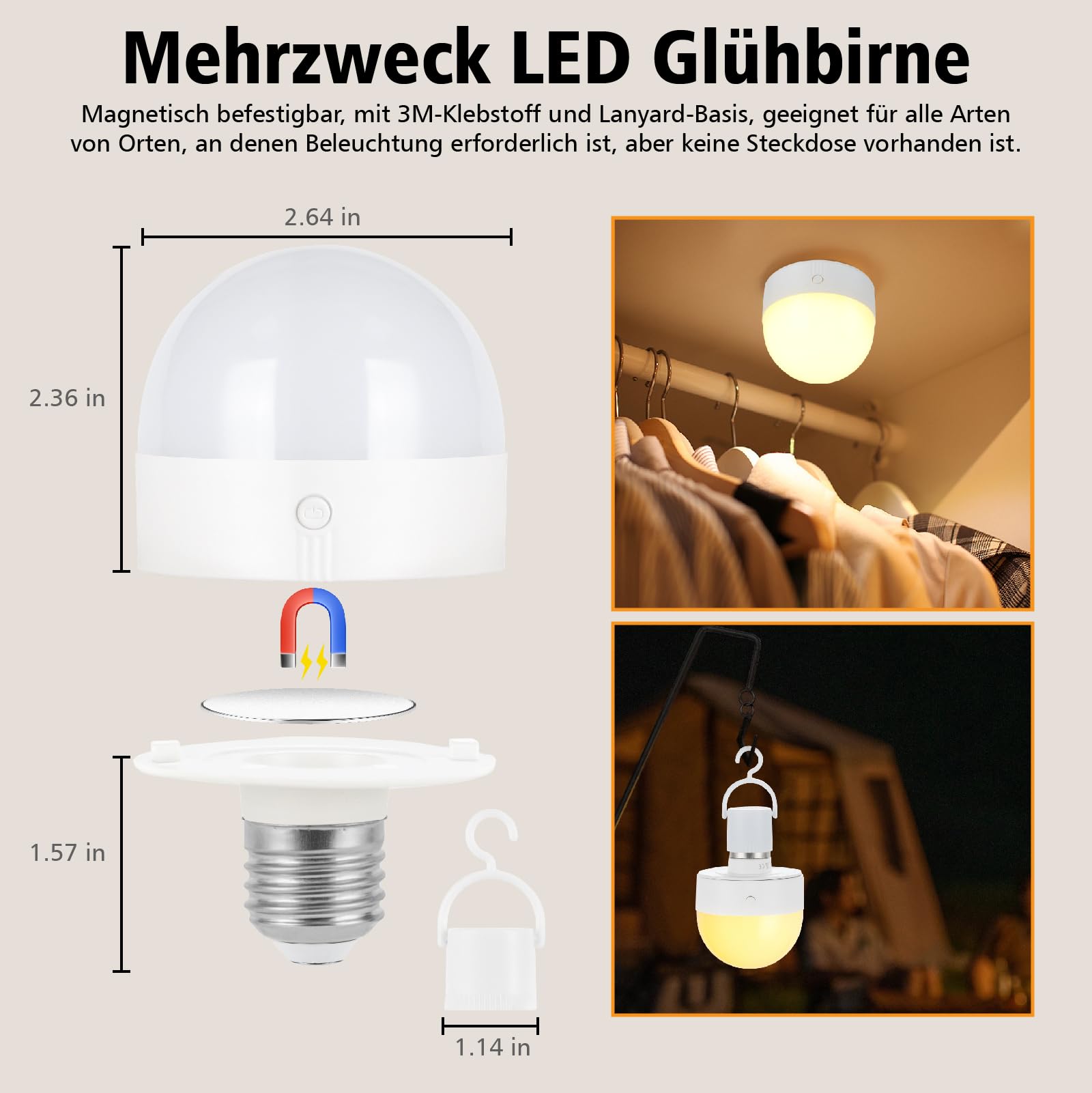 Endlich kabelloses Licht genau dort, wo du es brauchst! Diese geniale LED-Glühbirne mit USB-Aufladung gibt dir bis zu 20 Stunden Licht ohne Steckdose. Einfach per Fernbedienung zwischen 3 Farbtemperaturen (warmweiß, neutral, kaltweiß) und 4 Helligkeitsstufen wechseln. Das coole Magnet-Design ermöglicht einfaches Abnehmen zum Aufladen - kein mühsames Herausschrauben mehr! Perfekt für Camping, Gartenhaus oder als Notlicht. Mit Timer-Funktion (15-120 Minuten) ideal zum Einschlafen. Passt in jede E27-Fassung und haftet mit Magnet auch an Metallflächen. Inklusive 2 Glühbirnen, Fernbedienungen und USB-C Kabeln. Deine flexible Lichtlösung für jeden Einsatz!