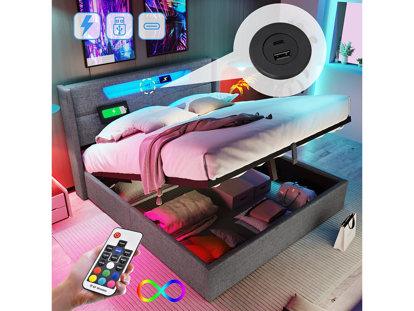 Dieses Bett hat alles, was du dir wünschen kannst! 140x200cm groß, mit 4 riesigen Schubladen für deine ganze Bettwäsche und Klamotten. Die Schubladen haben Rollen - super easy zu benutzen! Das LED-Kopfteil sieht nicht nur ultra-modern aus, sondern ist auch praktisch zum Lesen. USB und Type-C Anschlüsse zum Aufladen von Handy und Laptop direkt am Bett - keine Kabelwirrwarr mehr! Metallgestell mit Holzlattenrost - stabil und quietscht nicht. Meine Nachbarn haben sich das Bett gekauft und schwärmen nur davon. Wird in zwei Paketen geliefert, also nicht wundern wenn nicht alles gleichzeitig ankommt. Perfekt für moderne Schlafzimmer - spart Platz und sieht dazu noch mega stylisch aus. Beige Farbe passt zu fast jedem Einrichtungsstil. Einfach aufbauen und genießen!