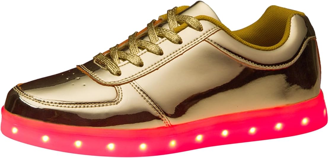 Leuchte auf mit diesen verrückten LED-Schuhen! Diese Damenschuhe mit bunten Leuchteffekten sind ein absoluter Hingucker. Wasserdichtes PU-Obermaterial und Gummisohlen machen sie perfekt für jeden Einsatz. Einfach per USB aufladen und schon leuchten sie in verschiedenen Farben! Mit 3cm flachem Absatz und Rundkappe super bequem zu tragen. Die Schnürung sorgt für perfekten Halt. Perfekt für Partys, Konzerte, Festivals oder einfach um im Dunkeln aufzufallen! Die gepolsterte Einlegesohle macht auch langes Tragen angenehm. Leicht und atmungsaktiv - ideal für Freizeit und Sport. Achtung: Die Größen fallen etwas kleiner aus, bitte entsprechend deiner Fußlänge wählen. In Gold, Silber oder Rot erhältlich. Mach deinen Outfit unvergesslich mit diesen einzigartigen Leuchtschuhen!