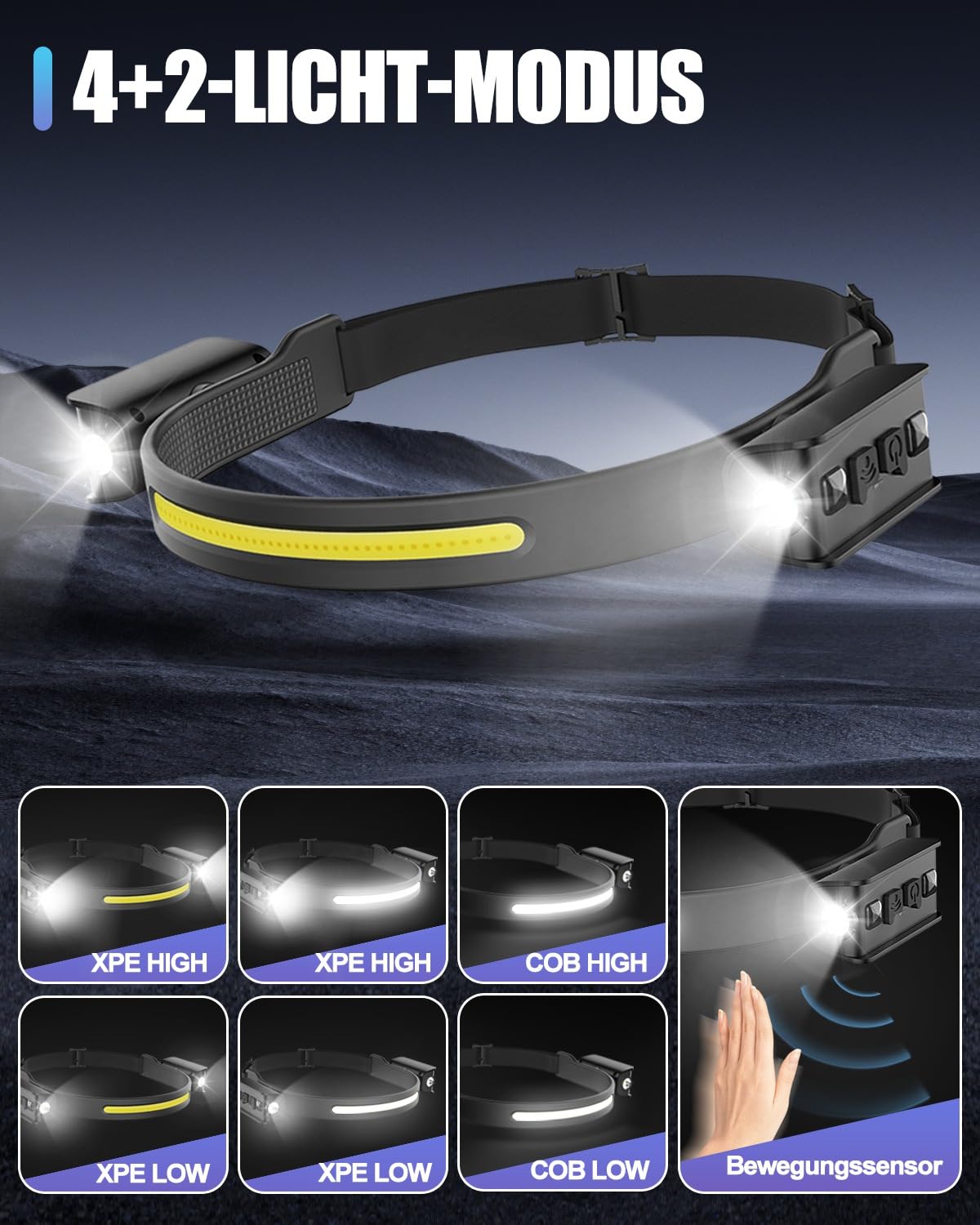 Das besondere Feature: Der integrierte Bewegungssensor! Einfach mit der Hand vor der Lampe wischen und sie geht an oder aus - super praktisch, wenn deine Hände schmutzig oder voll sind. Der ultraweite 230-Grad-Lichtkegel beleuchtet alles vor dir, ohne dass du den Kopf ständig bewegen musst.