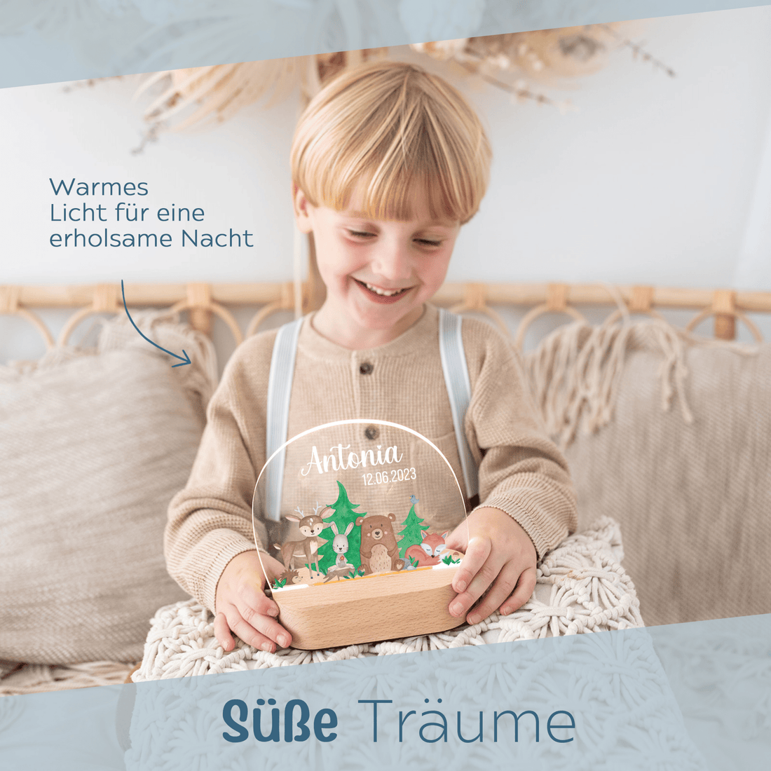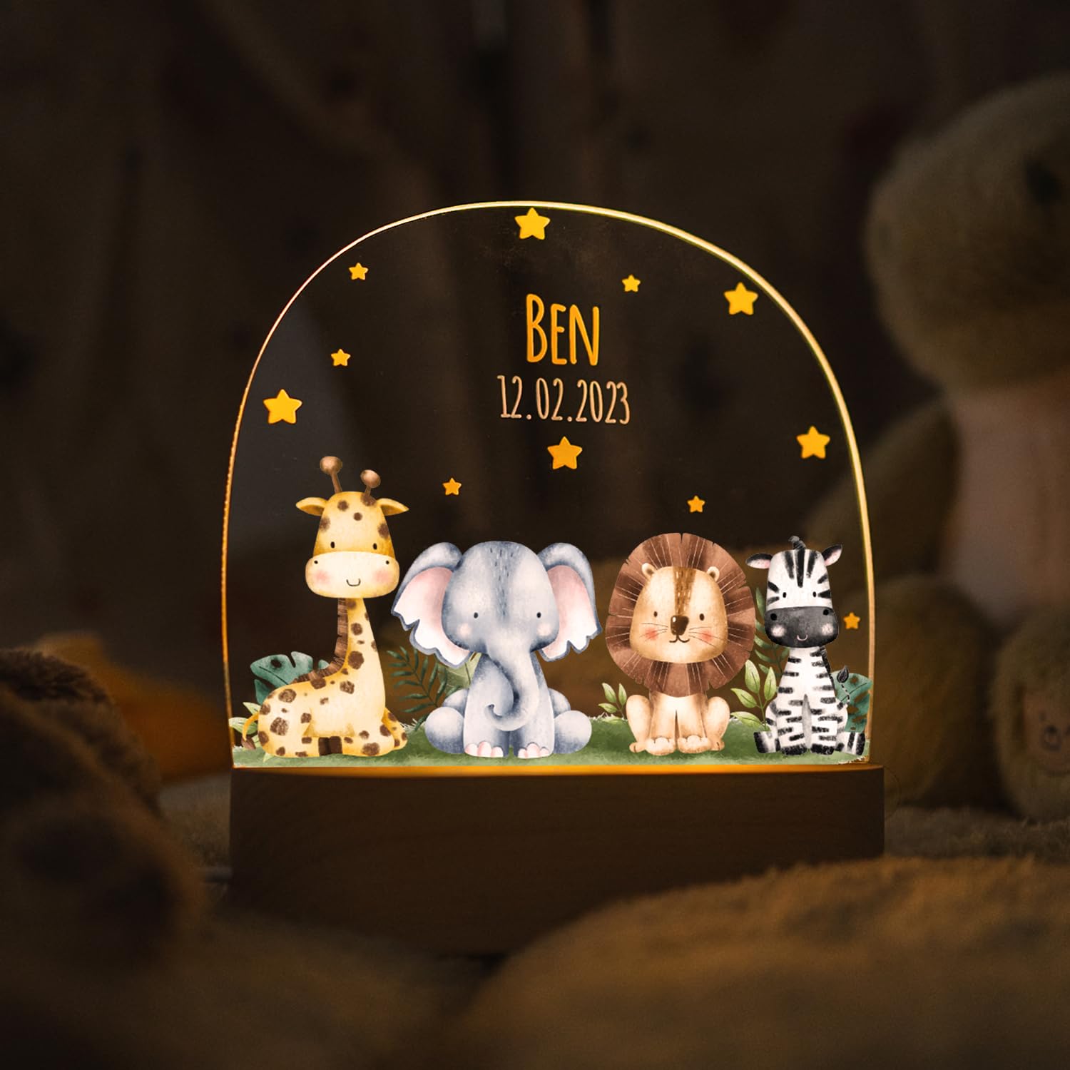 Was für ein süßes Nachtlicht! Dieses personalisierte LED-Licht mit den niedlichen Waldfreunden wird zum absoluten Liebling im Kinderzimmer. Du kannst es mit Namen und Datum individualisieren - ein ganz besonderes Erinnerungsstück! Aus 3mm Acrylglas in kristallklarer Optik, mit Holz-Sockel aus Buchenholz. Das sanfte, warmweiße LED-Licht beruhigt und hilft beim Einschlafen. Dimmbar und mit 3 Lichtmodi - perfekt für jede Stimmung. Über USB betrieben, also kein Batterie-Wechsel nötig. Ideal als Geschenk zur Geburt, Taufe oder Geburtstag. Maße: 15cm hoch. Achtung: Holz ist ein Naturprodukt, jedes Stück ist einzigartig! Mach deinem Kind eine Freude mit diesem persönlichen Nachtlicht!