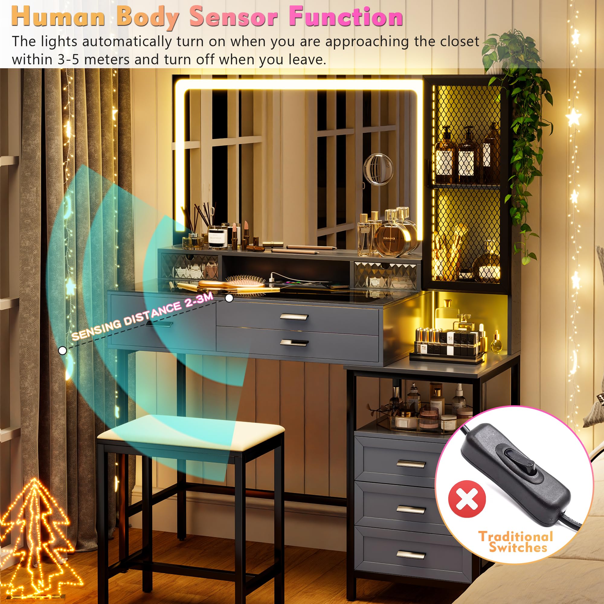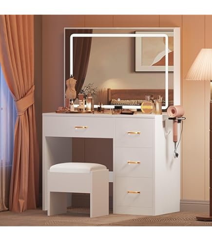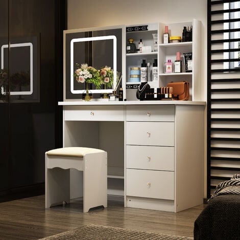 Dein persönliches Beauty-Studio für zu Hause! Dieser wunderschöne Schminktisch von LVYWEX bringt Hollywood-Flair in dein Schlafzimmer. Mit 120 cm Breite bietet er reichlich Platz für all deine Beauty-Produkte. Der integrierte LED-Ringlichtspiegel ist der absolute Star - mit drei einstellbaren Lichtfarben sorgt er für die perfekte Ausleuchtung ohne störende Schatten. So siehst du beim Schminken immer genau, was du tust! Die vier praktischen Schubladen (zwei große am Tisch, zwei weitere an den Seitenschränken) bieten ordentlich Stauraum für Make-up, Cremes, Schmuck und Accessoires. Die Arbeitsfläche mit Backlack-Lackierung ist nicht nur super pflegeleicht, sondern fühlt sich auch richtig hochwertig an. Das komplette Set inklusive stylischem Hocker und einem tragbaren Kosmetikkoffer im schicken Tweed-Design - perfekt für unterwegs! Aus umweltfreundlichen Materialien gefertigt und extrem langlebig. Mach dir jeden Morgen zur Beauty-Routine und fühl dich wie ein Star!