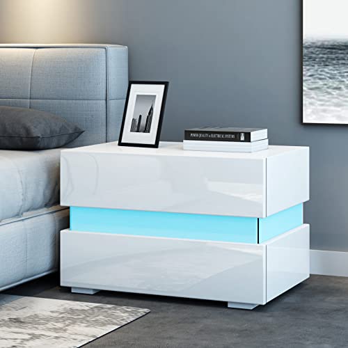 Dieser Nachttisch ist einfach der Hammer! Nicht nur super stylisch in Weiß, sondern auch mega praktisch: Mit RGB-LED-Beleuchtung, die du per Fernbedienung steuern kannst - ändere Farben, Helligkeit und Modi wie du willst! Noch besser: Oben sind 2 Steckdosen und 2 USB-Anschlüsse integriert - perfekt zum Laden von Handy, Tablet & Co. Mit 2 großen und 1 kleiner Schublade hast du reichlich Stauraum für alles, was du nachts griffbereit haben willst. Aus wasserfester Spanplatte und mit Hochglanz-Oberfläche - sieht nicht nur gut aus, sondern ist auch pflegeleicht. Maße: 45x40x52cm - passt perfekt neben jedes Bett! Einfach aufbauen und sofort nutzen. Ob im Schlafzimmer, Wohnzimmer oder Home-Office - dieser Nachttisch macht einfach alles mit!