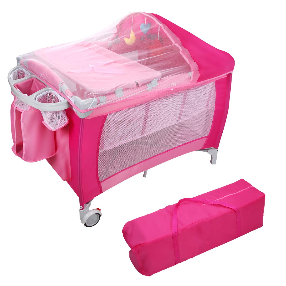 Ein Babybett, das mitwächst? Das LIFEZEAL 4-in-1 Reisebett ist echt praktisch! Es funktioniert als Schlafplatz, Stubenwagen, Spielbett und hat sogar einen integrierten Wickeltisch. Für Babys von 0 bis 36 Monaten perfekt geeignet. Das Gestell ist aus stabilen Eisenrohren, die mit weichem Baumwollstoff umwickelt sind - so stößt sich dein Kleines nicht. Der Spielbogen mit den süßen Glöckchen sorgt für Unterhaltung, und der seitliche Reißverschluss erleichtert das Rein- und Rausheben. Wenn du mal unterwegs bist, klappst du das Bett einfach zusammen und packst es in die Tragetasche. Die Rollen unten machen es mobil, und der Aufbewahrungskorb bietet Platz für Windeln und Fläschchen. Perfekt für zu Hause, Reisen oder Besuche bei den Großeltern!