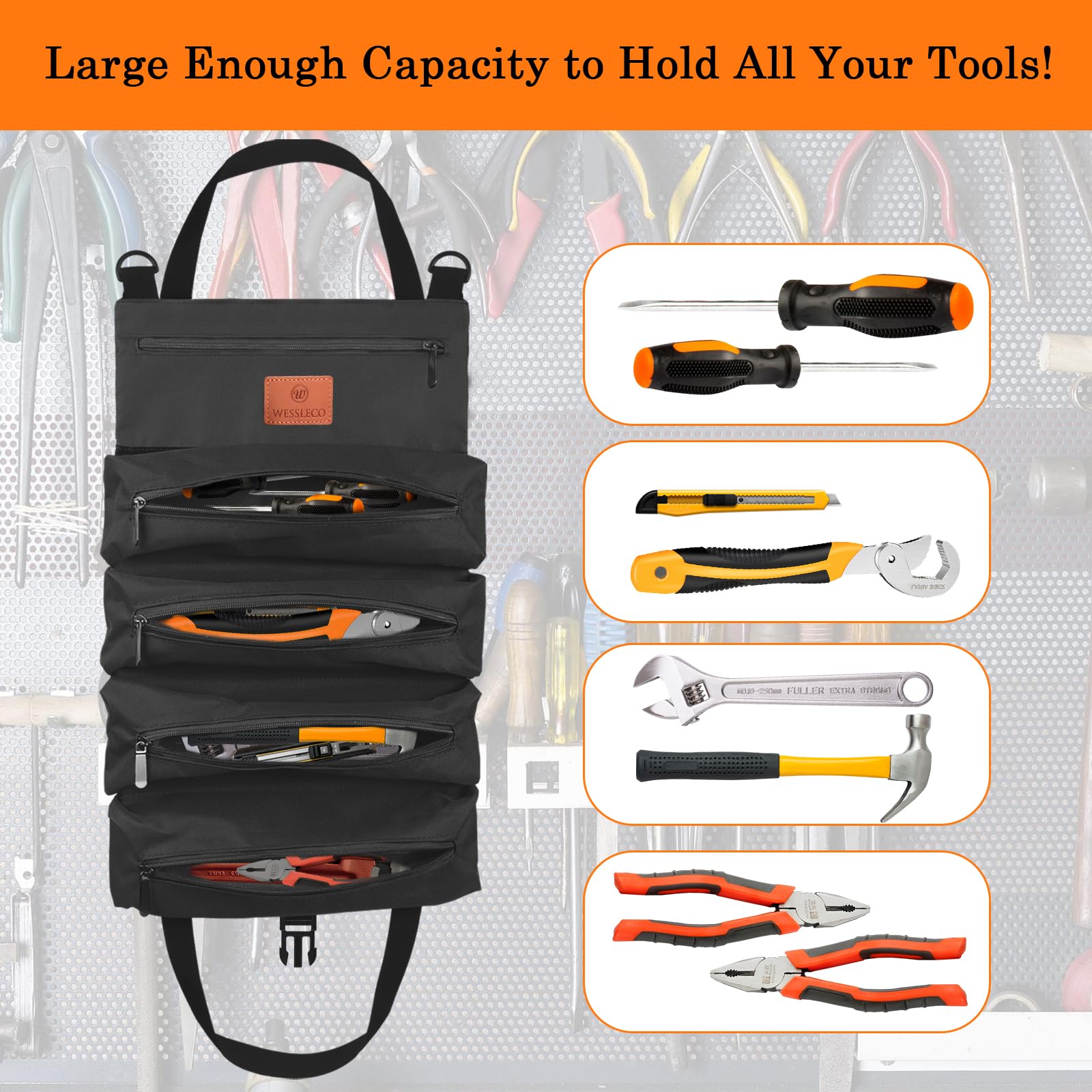 Hey du Handwerker! Diese Werkzeugtasche von LUMITRRA ist echt praktisch - sie lässt sich einfach zusammenrollen und mitnehmen. Mit 5 Reißverschlussfächern hast du alles super organisiert und findest deine Werkzeuge sofort. Ob du nun Klempner, Elektriker oder Hobbybastler bist - hier passt alles rein was du brauchst. Der verstellbare Schultergurt und der Tragegriff machen den Transport mega easy. Aus robustem Oxford-Stoff gefertigt, ist die Tasche reißfest und sogar wasserdicht. Perfekt für unterwegs: passt unter den Autositz, in den LKW oder aufs Motorrad. Stell dir vor, wie entspannt du arbeiten kannst, wenn alle Werkzeuge ihren festen Platz haben und nichts verloren geht. Einfach ausrollen, Werkzeuge rausnehmen und loslegen. Nach getaner Arbeit alles wieder ordentlich verstauen und zusammenrollen - so einfach war Werkzeugtransport noch nie! Egal ob auf der Baustelle, bei Renovierungen oder zu Hause in der Werkstatt - diese Tasche wird dein neuer bester Freund.