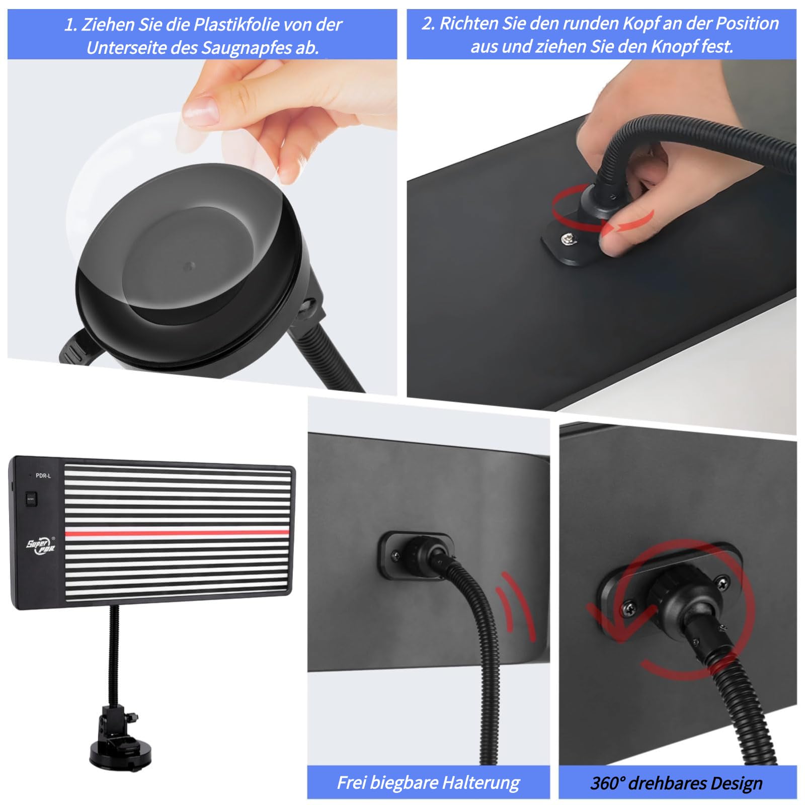 Einfache Anwendung: Halterung an der Karosserie befestigen, Licht einschalten und die Dellen erscheinen sofort als verzerrte Linien. Während der Reparatur siehst du sofort, wann die Delle weg ist - nämlich wenn die Linien wieder parallel verlaufen.
