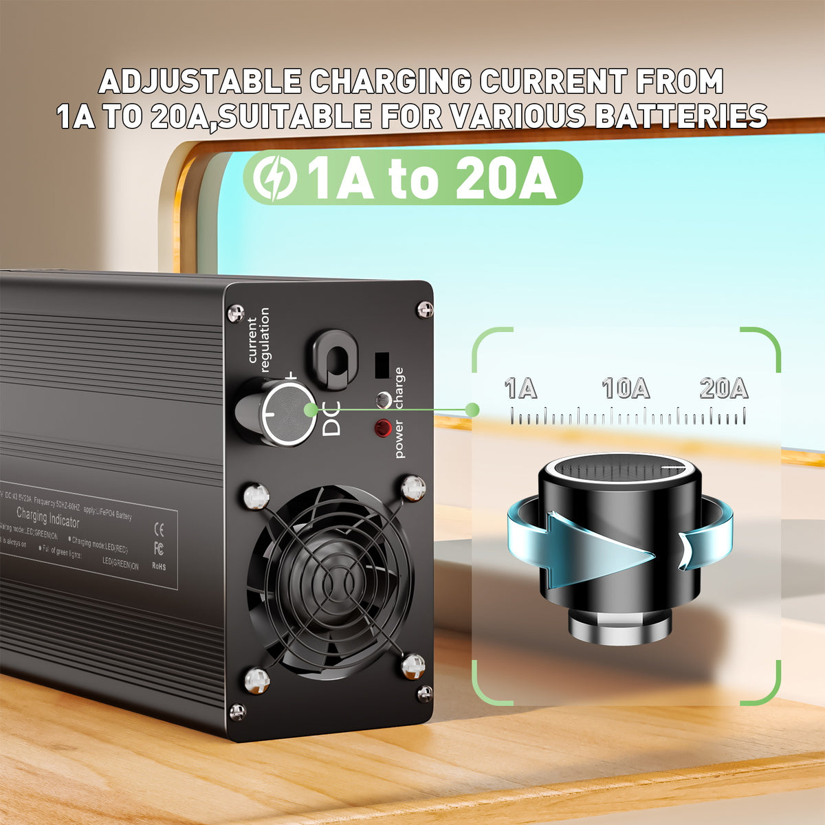 Boah, dieses LiFePO4 Ladegerät von ZTZBFGM ist ja mal richtig professionell! Für 48V 16s Lithium-Eisen-Phosphat-Akkus mit einstellbarem Strom bis 20A. Maximale Ladespannung 58,4V, passt für Akkus von 20Ah bis 200Ah. Mit intelligentem Chip für Mehrfach-Ladeschutz und Temperatursensor. Lüfter kühlt automatisch bei Hitze. Aluminium-Gehäuse für bessere Wärmeableitung. Verschiedene Anschlüsse verfügbar. Perfekt für Elektrofahrräder, Autos, Golfwagen und mehr. Ladezeit nur 6-8 Stunden. Einfach ein Muss für alle mit Lithium-Akkus!