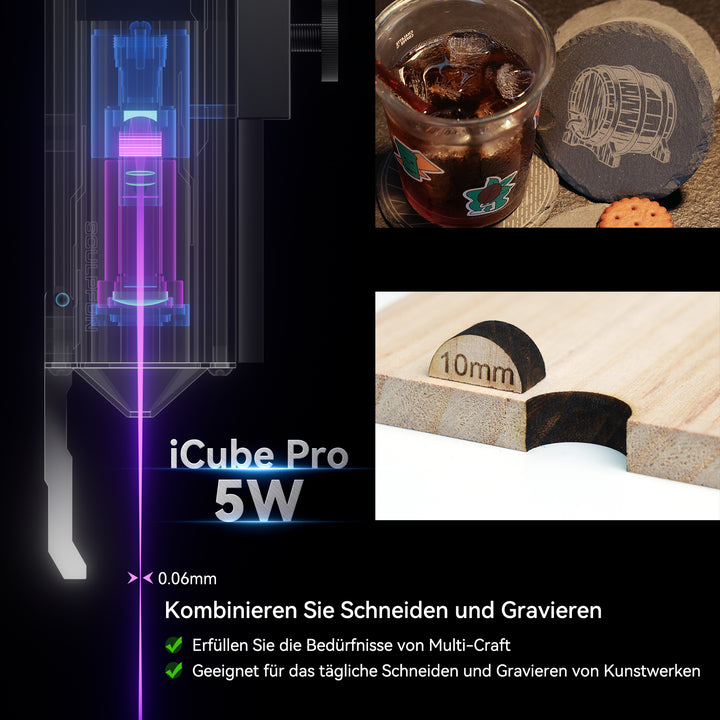 Die ultimative Laser-Lösung für Kreative! Der SCULPFUN iCube kombiniert 12W Diode UND 1,2W Infrarot Laser in einem Gerät. Gravieren und schneiden auf Holz, Metall, Leder, Keramik - fast alles ist möglich!