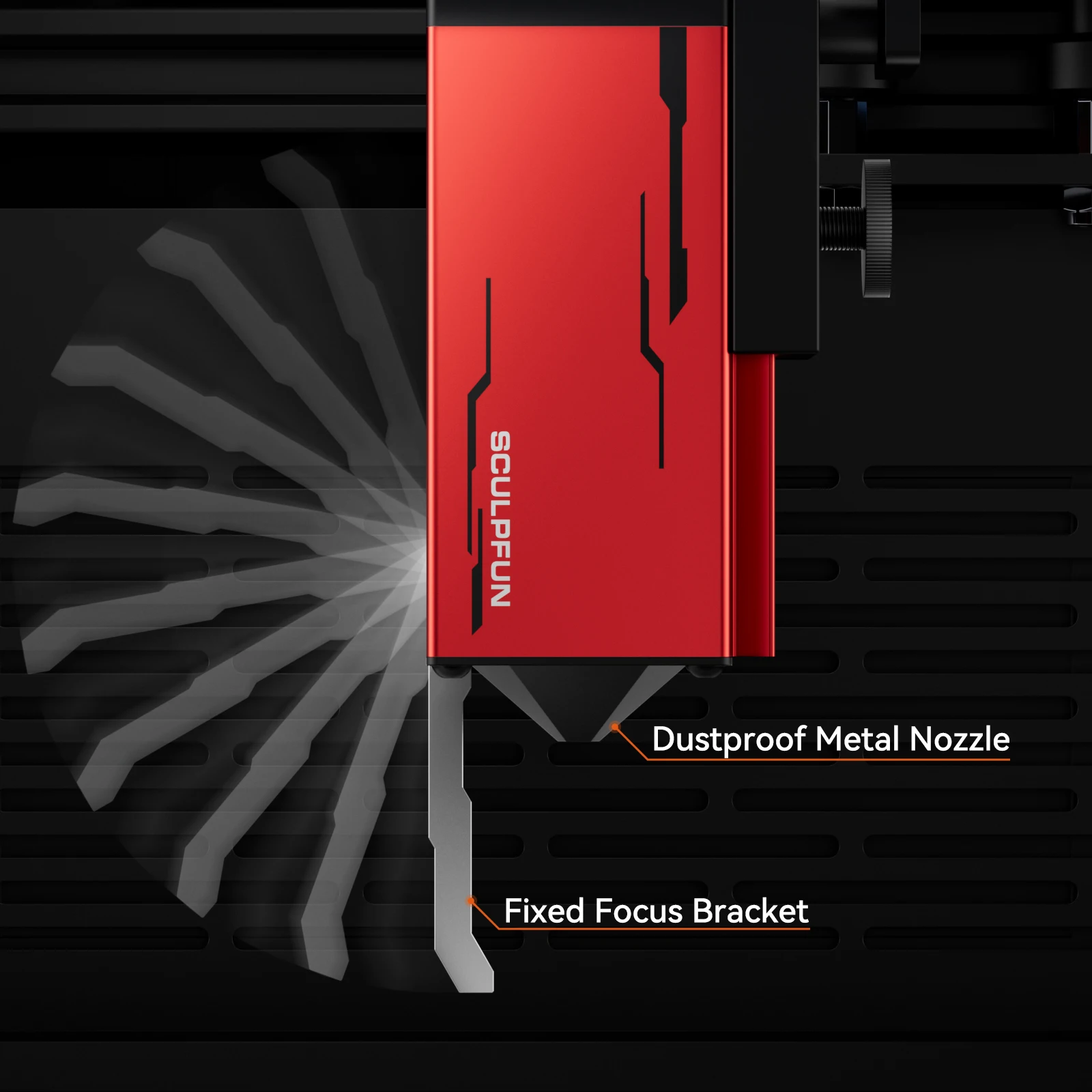 150×150mm Arbeitsbereich, Autofokus, 10.000 mm/min Geschwindigkeit. Vollständig geschlossen mit Rauchfilter - sicher für Zuhause. Klasse 1 Sicherheitszertifizierung.