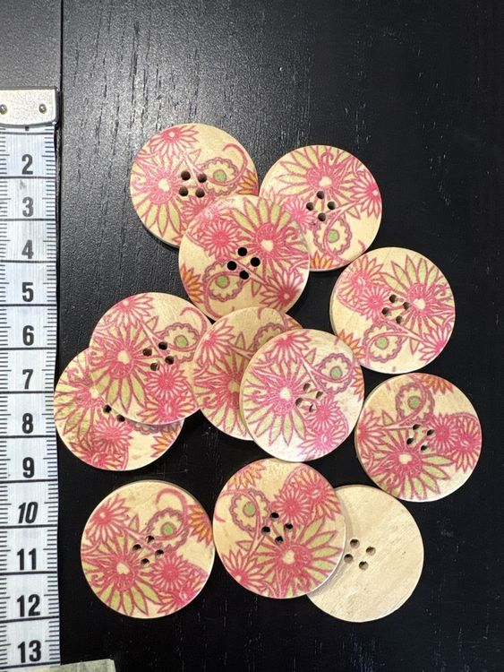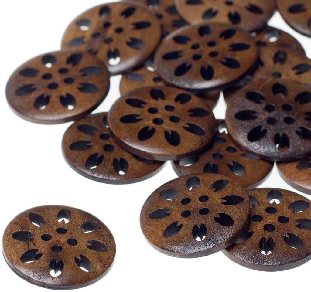 Total süße Holzknöpfe mit Blumenmotiv! Im Set sind 25 Stück enthalten - genug für mehrere Nähprojekte. Jeder Knopf hat 2,5 cm Durchmesser und 4 Löcher mit je 3 mm Durchmesser, was das Annähen super einfach macht. Die dunkelbraune Lasur sieht edel aus und das ausgestanzte Blumenmotiv gibt den Knöpfen einen vintage Charakter. Perfekt zum Aufhübschen von Jacken, Blusen, Kleidern oder Trachten. Aber nicht nur für Kleidung - du kannst damit auch Kissen verzieren, Lampenschirme aufpeppen oder Schmuck basteln. Aus natürlichem Holz gefertigt, fühlen sie sich angenehm an und sind langlebig. Verleihe deiner alten Jeansjacke neuen Charme oder mach aus einem einfachen Blazer ein Unikat. Die Möglichkeiten sind endlos! Auch super für Scrapbooking oder Cardmaking-Projekte. Mit diesen vielseitigen Knöpfen kannst du deiner Kreativität freien Lauf lassen. Einfach aufnähen oder aufkleben und schon sieht alles viel persönlicher aus!