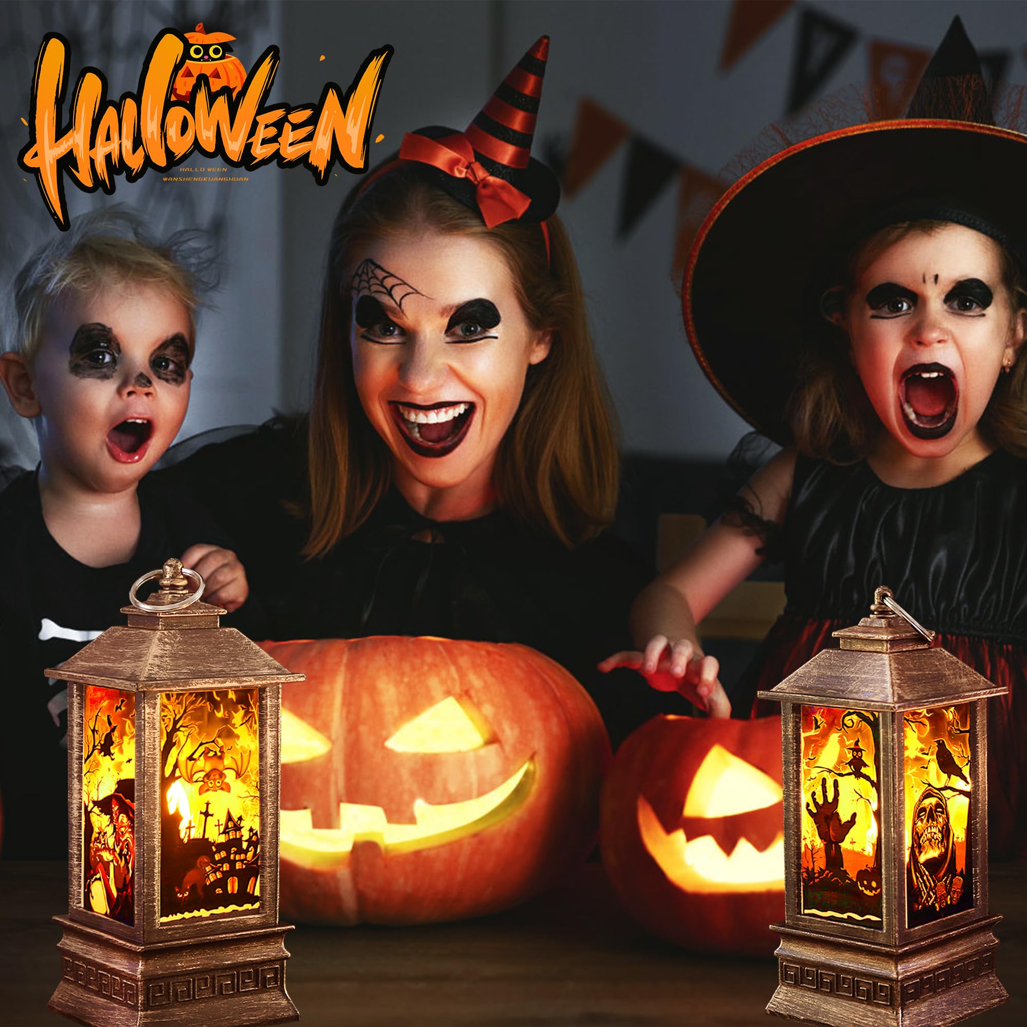 Yo, Halloween steht vor der Tür und diese Laternen machen jede Party richtig gruselig! Die beiden LED-Laternen in Gold bringen sofort Halloween-Stimmung in dein Zuhause. Mit ihren coolen Motiven wie Skeletten, Fledermäusen und Kürbissen sind sie der absolute Hingucker.\n\nMaße: 20x8,5x8,5cm\nMaterial: PVC + Acryl\nLicht: Orange LEDs\nBatterien: 3x AAA (nicht enthalten)\n\nDas coole Feature: Die LEDs imitieren echte Flammen - flackern total realistisch aber ohne Brandgefahr! Perfekt für Familien mit Kindern oder Haustieren.\n\nEinsatzorte:\n- Vorgarten und Veranda\n- Wohnzimmer-Deko\n- Kinderzimmer\n- Halloween-Partys\n- Fensterbänke\n\nEinfach aufstellen oder aufhängen (ja, die haben praktische Aufhängeringe!) und schon ist die Grusel-Stimmung perfekt. Die Dinger sind super leicht und kannst du überall mit hinnehmen. Ob im Garten, auf dem Balkon oder im Kinderzimmer - überall sorgen sie für die richtige Halloween-Atmosphäre.\n\nUnd keine Sorge wegen dem Strom: Die LEDs verbrauchen kaum Energie und halten ewig. Einfach Batterien rein und wochenlang Spaß haben! So macht Halloween dekorieren richtig Laune.