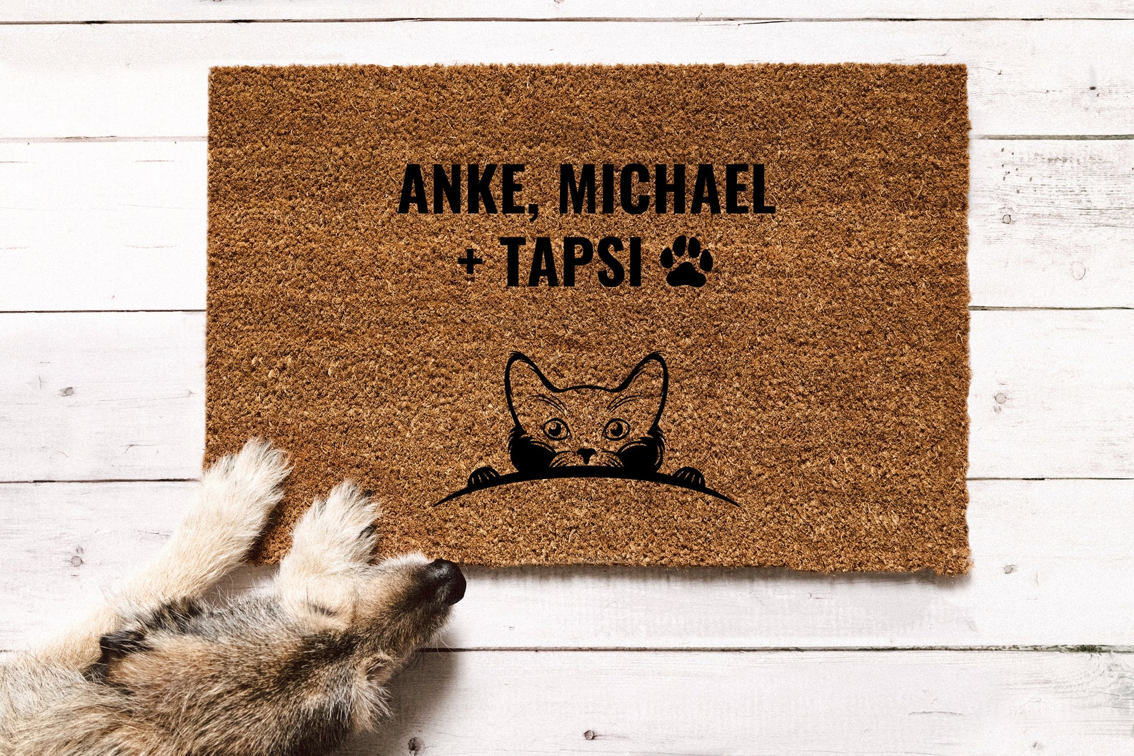 Hey, diese personalisierte Fußmatte ist ja der absolute Hit für alle Katzenliebhaber! Mit dem Spruch \Hier Leben Verwöhnte Katzen Mit Ihrem Personal\ bringst du jeden Besucher zum Schmunzeln. Erhältlich in 60x40cm, 75x50cm oder 90x60cm - wähle deine Wunschgröße! Aus hochwertigem 100% Polyester mit 1200g/m² für extra Langlebigkeit. Der gestochen scharfe Druck ist UV-beständig und die rutschfeste Unterseite sorgt für Sicherheit. Einfach mit Namen oder eigenem Text personalisieren - klick auf \Jetzt anpassen\! Leicht zu reinigen mit Wasser und milder Seife. Perfekt als Geschenk für Katzenfreunde oder für dich selbst. Mach deinen Hauseingang unverwechselbar mit dieser lustigen und praktischen Fußmatte!