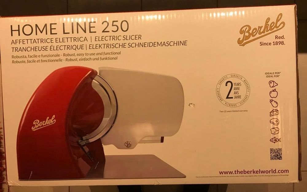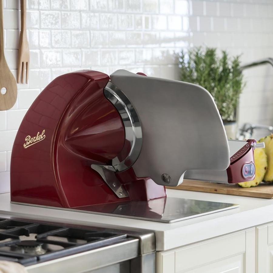 Schneiden wie ein Profi - mit dem Berkel Home Line 250 Lebensmittelschneider! Dieses elegante Gerät in markantem Berkel-Rot ist nicht nur ein Hingucker in deiner Küche, sondern auch ein echter Leistungsträger. Mit der 25,4 cm großen verchromten Stahlklinge schneidest du alles in perfekte Scheiben: Prosciutto, Fleisch, Käse, Fisch, Brot, Obst und Gemüse - einfach alles! Bis zu 20 mm Dicke sind möglich, mit Millimetergenauigkeit. Das Gehäuse aus roter Aluminiumlegierung ist nicht nur stylisch, sondern auch super langlebig. Die Reinigung? Ein Kinderspiel! Die Klingenabdeckung lässt sich einfach abnehmen und alle Teile sind spülmaschinenfest. Mit den professionellen Druckknöpfen und LED-Anzeige behältst du immer die Kontrolle. Für 115 V, 60 Hz ausgelegt - einfach einstecken und loslegen! Ob für den täglichen Gebrauch oder besondere Anlässe - mit diesem Schneider wird jede Mahlzeit zum Erlebnis. Hol dir Profi-Qualität nach Hause!