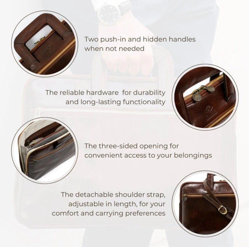 Diese Time Resistance Aktentasche ist einfach nur wow! Aus italienischem Vollnarbenleder handgefertigt - da merkst du sofort die Qualität. Vollnarbenleder ist das hochwertigste Leder überhaupt, mit natürlicher Maserung das mit der Zeit eine wunderschöne Patina entwickelt. Jedes Stück ist ein Unikat! Die Tasche wird in Italien von erfahrenen Handwerkern gefertigt - das sieht man jeder Naht an. Pflanzlich gegerbt, nachhaltig und umweltfreundlich. Der natürliche Ledergeruch ist wie ein feines Parfüm! Perfekt für Business, Meetings oder täglichen Gebrauch. Stilvoll, professionell und unglaublich langlebig. Mit YKK-Reißverschlüssen und robusten Nähten ist diese Tasche für die Ewigkeit gemacht. Ob für Herren oder Damen - dieses Statement-Stück unterstreicht deinen Stil und deine Professionalität. Mehr als nur eine Tasche - ein Begleiter fürs Leben!