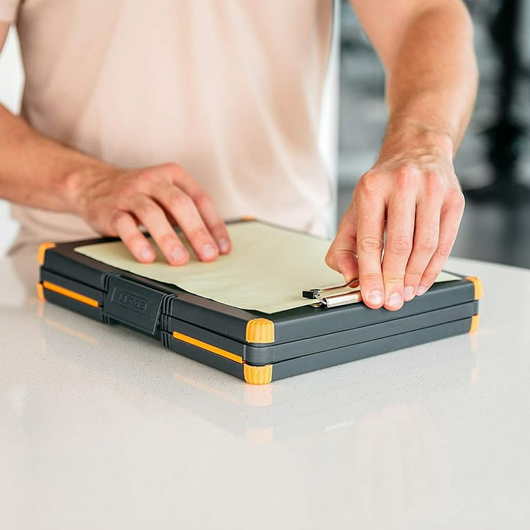 Das ultimative Klemmbrett für unterwegs! Das Dexas XL Slimcase 2 vereint praktisches Klemmbrett mit sicherem Aufbewahrungsfach in einem. Mit den Maßen 39,4 x 26,7 x 2,5 cm bietet es Platz für Papier in legaler Größe und Notizblöcke. Aus schlagfestem, bruchfestem Kunststoff schützt es deine Unterlagen zuverlässig. Der robuste Stahlclip in Orange hält Papiere sicher fest, während das verriegelbare Fach vor Regen und Wind schützt. Das schlanke Design passt perfekt in Aktentaschen oder Rucksäcke. Ideal für Schule, Uni, Arbeit oder unterwegs - ob auf der Baustelle, im Außendienst oder im Homeoffice. Alles immer griffbereit und geschützt!