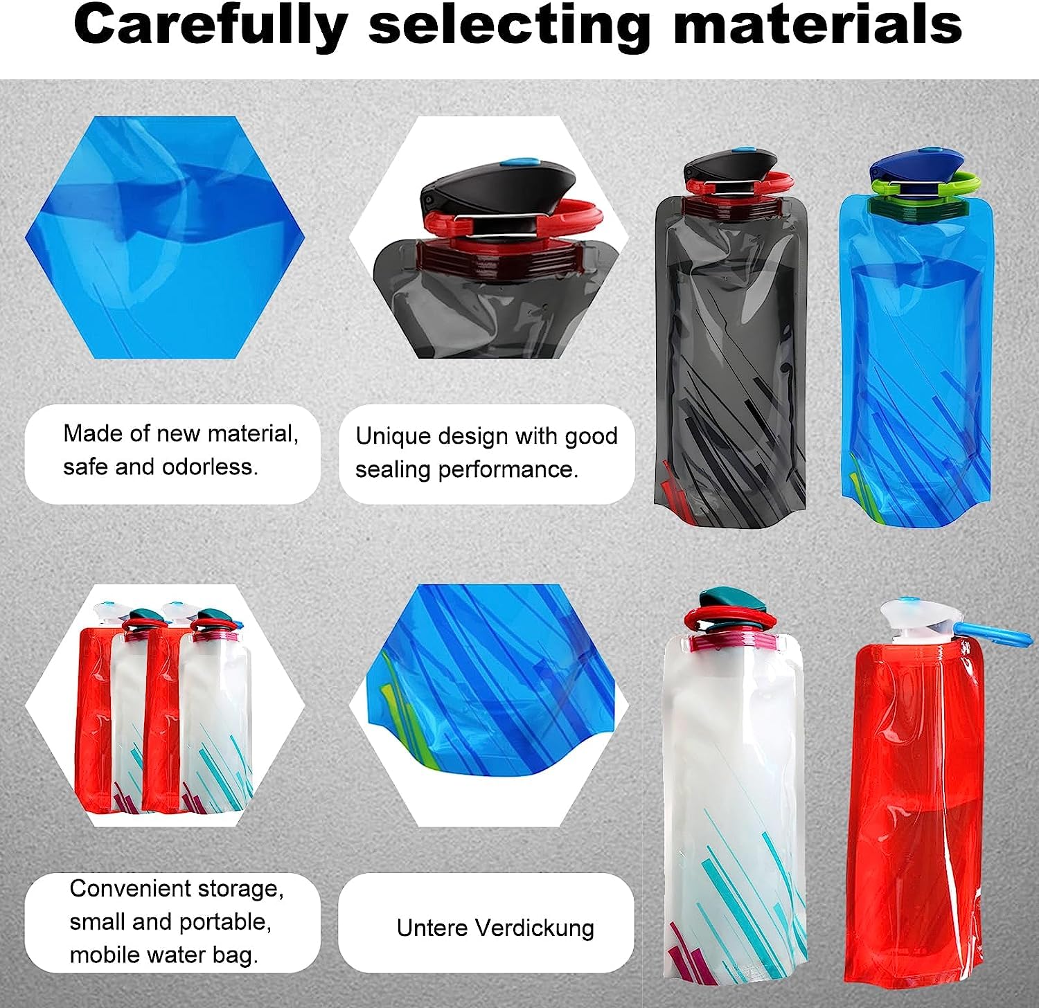 Boah, diese faltbaren Wasserflaschen sind einfach genial für unterwegs! Das 6er-Set in Schwarz, Weiß und Blau gibt dir immer genug Trinkwasser parat - ob beim Wandern, Camping oder auf Reisen. Jede Flasche fasst 700ml und lässt sich auf 1/4 der Originalgröße zusammenfalten - super platzsparend in deinem Rucksack! Aus BPA-freiem FDA-zugelassenem Polyethylen sind sie absolut gesundheitlich unbedenklich. Der breite Mund macht das Befüllen und Reinigen zum Kinderspiel. Stell dir vor, wie du damit durch die Natur wanderst und immer frisches Wasser dabei hast! Jede Flasche kommt mit nem praktischen Karabiner - einfach an deinem Rucksack oder Gürtel befestigen und schon hast du die Hände frei. Besonders clever: Du kannst die Flaschen auch als Kühlpackungen nutzen - einfach halbvoll in den Gefrierschrank stellen und genieße stundenlang kühle Getränke! Die robuste Dichtung ist absolut auslaufsicher und die Flasche steht stabil, wenn sie voll ist. Perfekt für Sport, Reisen, Picknicks oder einfach für den täglichen Gebrauch. Mit Leikurvo bekommst du nicht nur qualitativ hochwertige Produkte, sondern auch super Service. Hol dir dieses praktische Set und sei immer bestens hydriert!