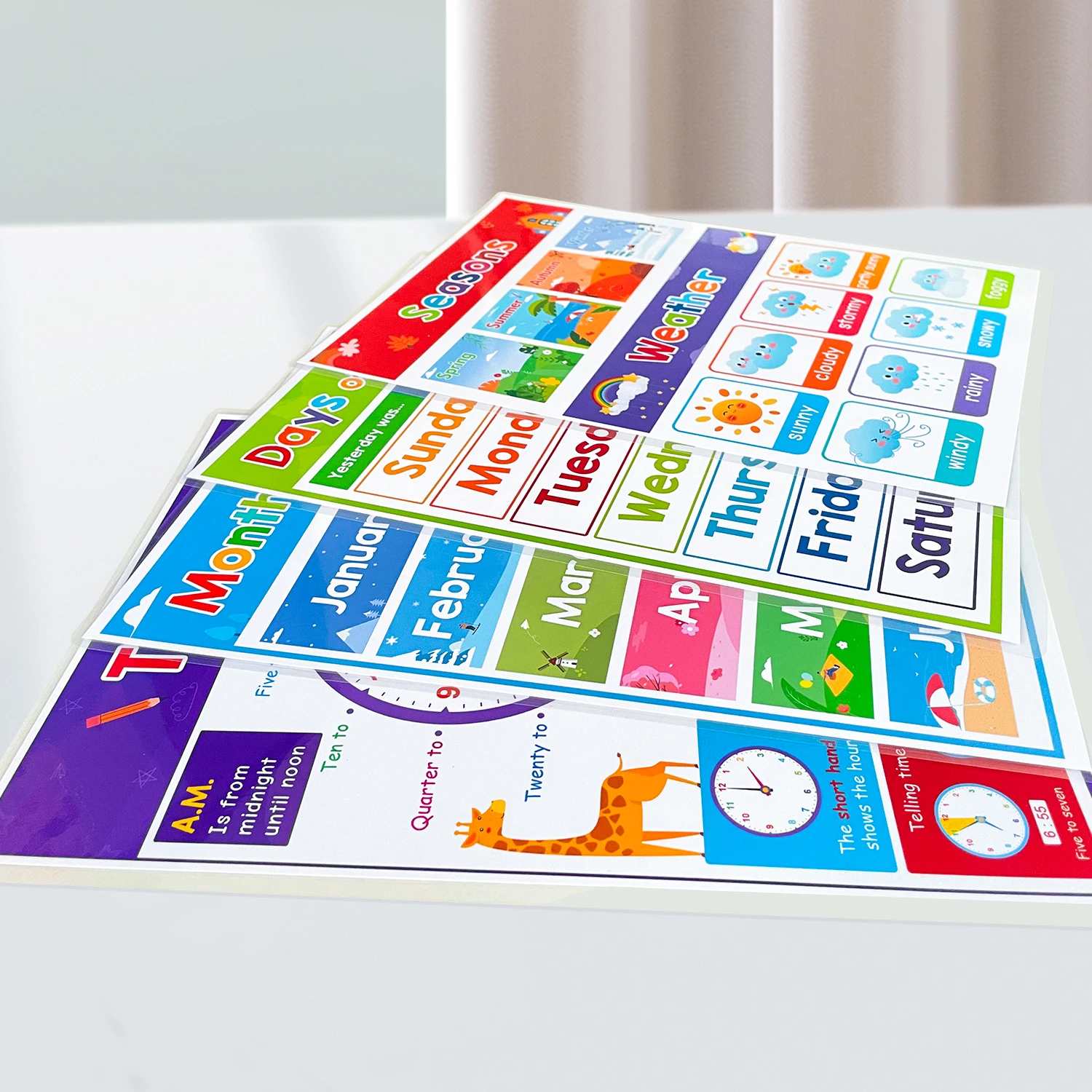 Lernen macht mit diesen bunten Postern richtig Spaß! 4 verschiedene Motive: Jahreszeiten, Monate, Wochentage und das Sonnensystem. Aus beschichtetem Kunstdruckpapier - robust und langlebig. Mit 41,8x28,8cm perfekt für Kinderzimmer, Klassenzimmer oder den Kühlschrank. Die leuchtenden Farben wecken die Neugier und helfen beim Englisch lernen. Einfach an Wand, Tür oder Whiteboard befestigen. Ideal für Vorschule, Kindergarten oder Heimunterricht. Mach deinem Kind das Lernen leicht und verspielte - mit diesen fröhlichen Bildungs-Postern!