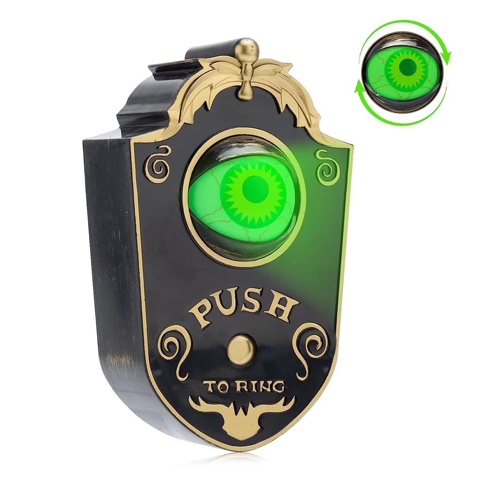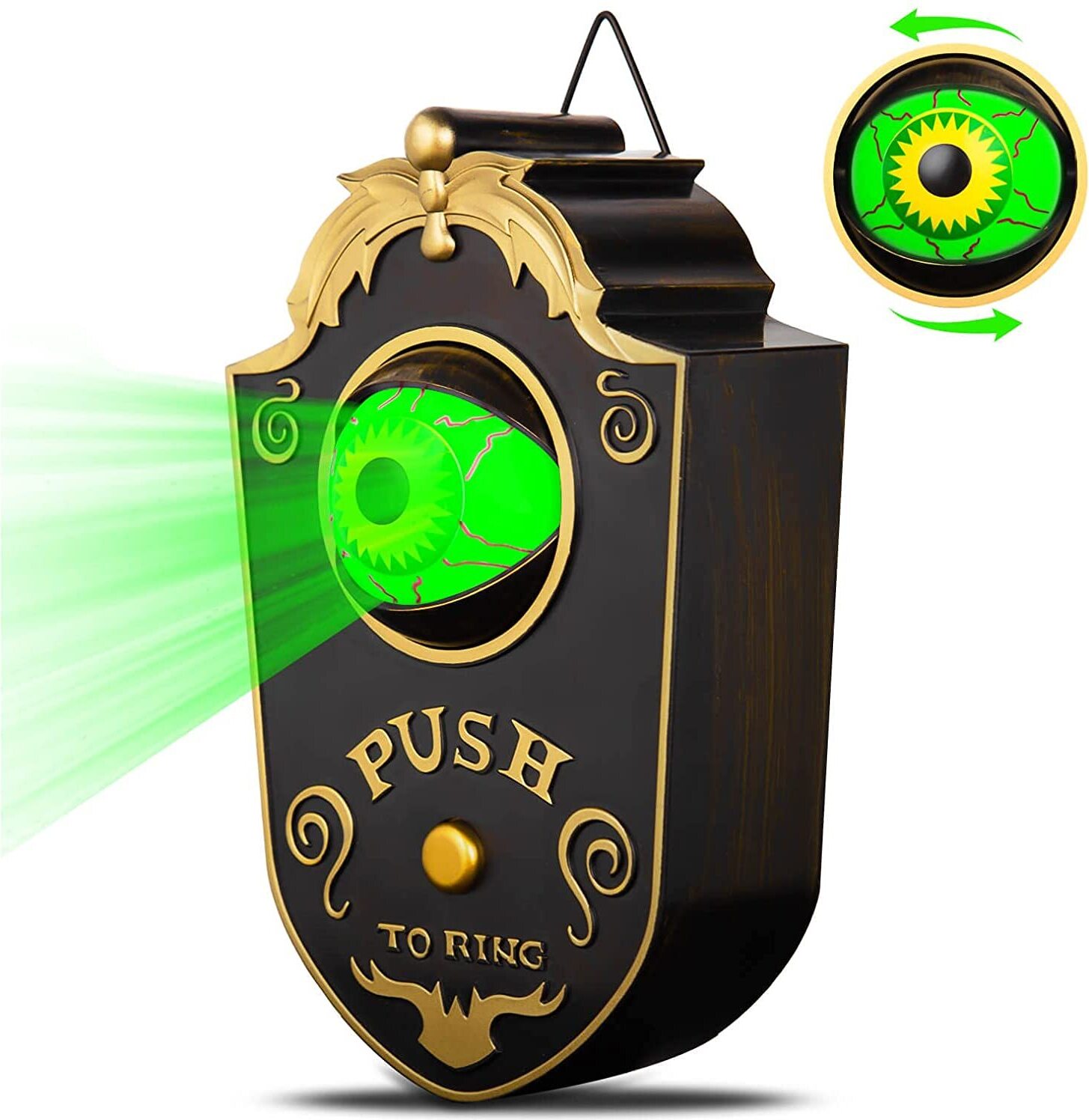 Willst du deine Halloween-Besucher richtig erschrecken? Diese gruselige Türklingel ist der absolute Hit! Drückt jemand auf den Knopf, öffnen sich die Augen, leuchten grün, rollen hin und her - und dazu ertönen unheimliche Geräusche.
