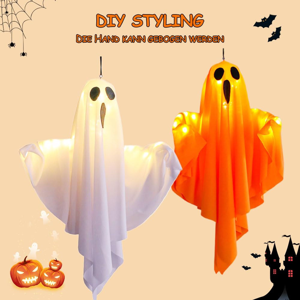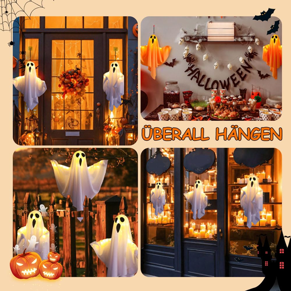Gruseleffekt garantiert! Diese Halloween-Geister mit integrierter Lichterkette (warmweiß, batteriebetrieben) schweben ganz realistisch im Wind und sorgen für Gänsehaut-Feeling im Garten, auf der Terrasse oder am Balkon. Aus wetterfestem Polyester, ca. 50 cm hoch, mit beweglichen Armen zum Formen. Einfach aufhängen – fertig! Kein Strom nötig, nur Batterien. Perfekt für Mottopartys, Gruselnächte oder als Blickfang im Vorgarten. Mit diesen Geistern wird Halloween unvergesslich!