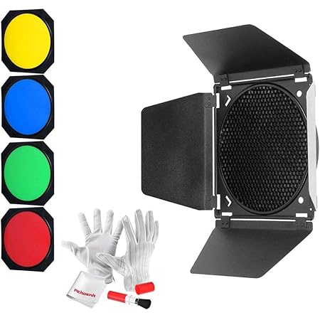 Verbessere deine Blitzfotografie mit diesem professionellen Walimex Lichtformer-Set! Enthalten sind Abschirmklappen mit Waben und bunte Farbfilter für kreative Lichtakzente.