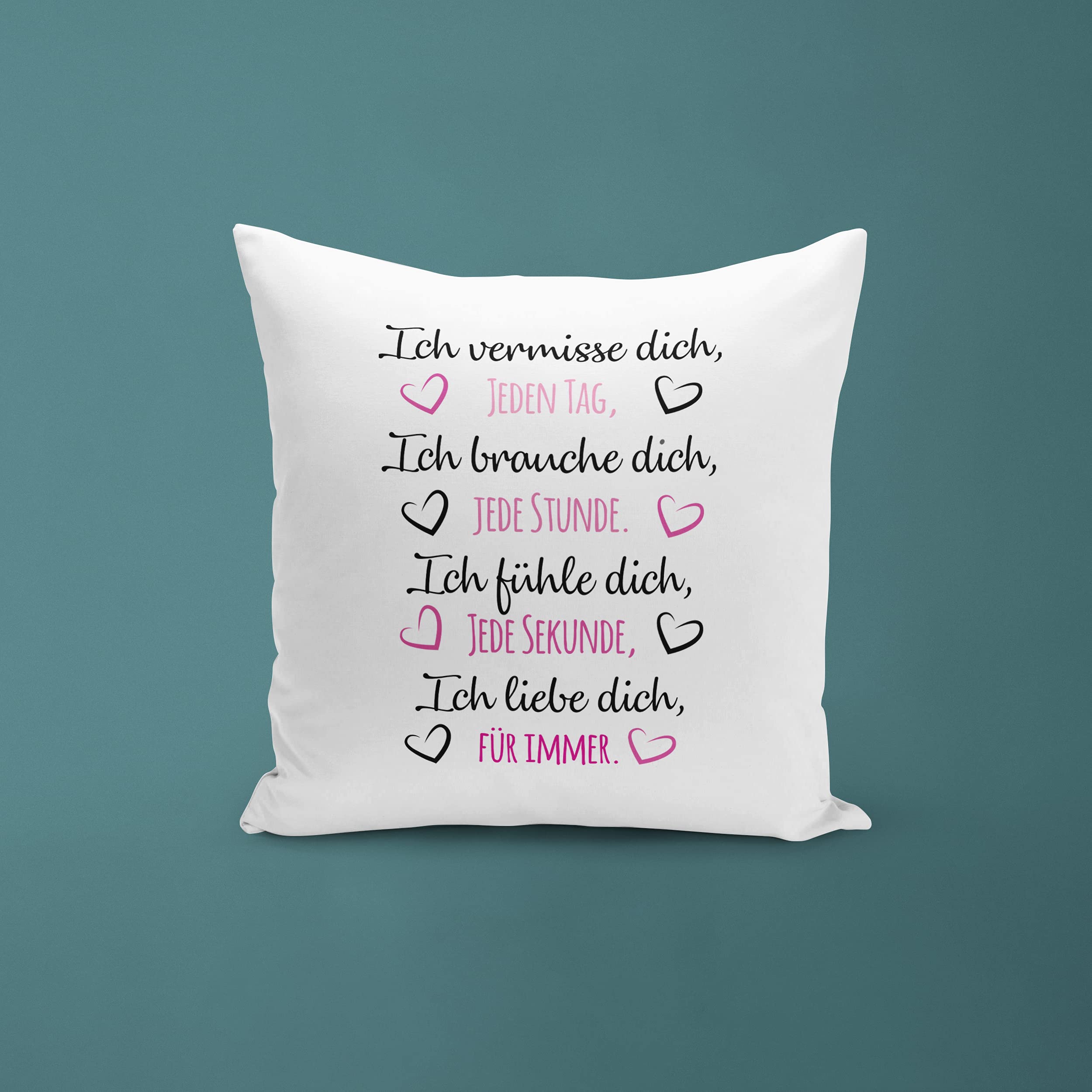 Suchst du ein romantisches Geschenk für deinen Liebsten? Dieses 'Ich vermisse Dich'-Kissen spricht direkt aus dem Herzen! In weiß mit zärtlichem Spruch, perfekt für Fernbeziehungen oder als liebevolle Aufmerksamkeit. Mit 40x40cm Maßen und weicher Füllung ideal zum Kuscheln. Der Bezug aus 100% Polyester ist bei 40°C waschbar (einfach auf links drehen). In Deutschland designed und bedruckt. Ein persönliches Geschenk für Partner, Freunde oder Familie - ob zum Geburtstag, Jahrestag oder einfach so. Zeig deine Gefühle auf charmante Weise!