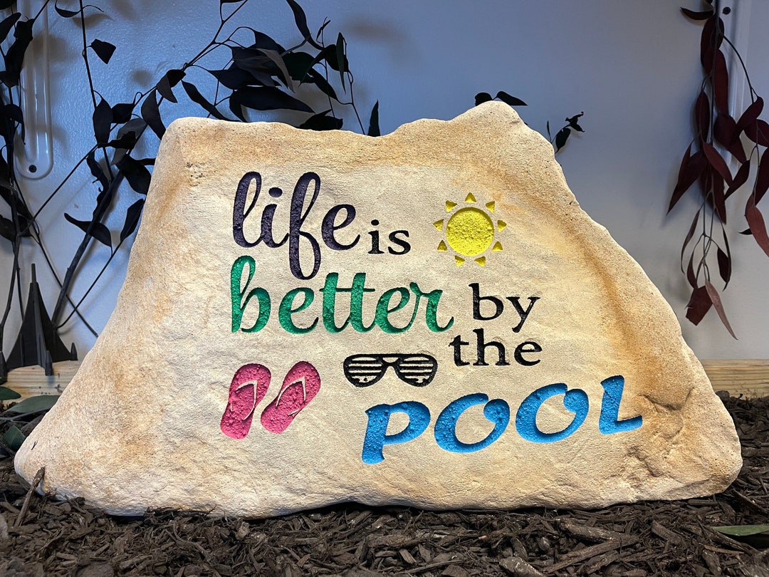 Charmantes Blechschild für deine Pool-Area! Mit der fröhlichen Aufschrift 'Life is Better by the Pool' in 17,8x38,1cm. Aus wetterbeständigem Metall mit lebendiger Farbe. Inklusive Staffelei-Rückseite und 2 Aufhänger - perfekt für Wand oder freistehend. Ideal als Geschenk für Poolbesitzer oder zur Verschönerung deines Gartens. Bring Sommerstimmung in deinen Außenbereich!