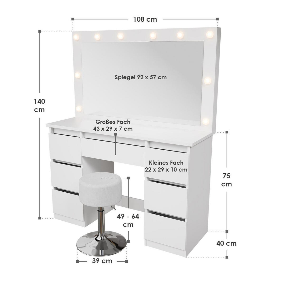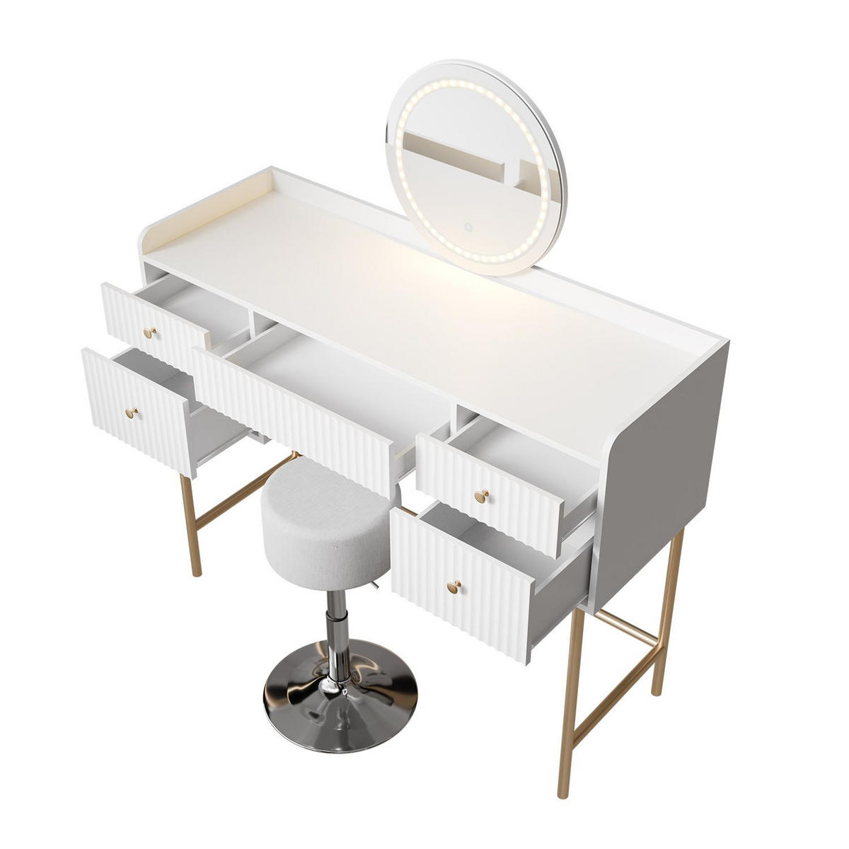 Ehrlich gesagt, dieser Schminktisch ist ein echter Game-Changer! Stell dir vor: Du sitzt morgens bequem auf dem Hocker, stellst das Licht genau so ein, wie du es brauchst, und hast all deine Beauty-Produkte perfekt organisiert in Reichweite. Kein Suchen mehr, kein Chaos!