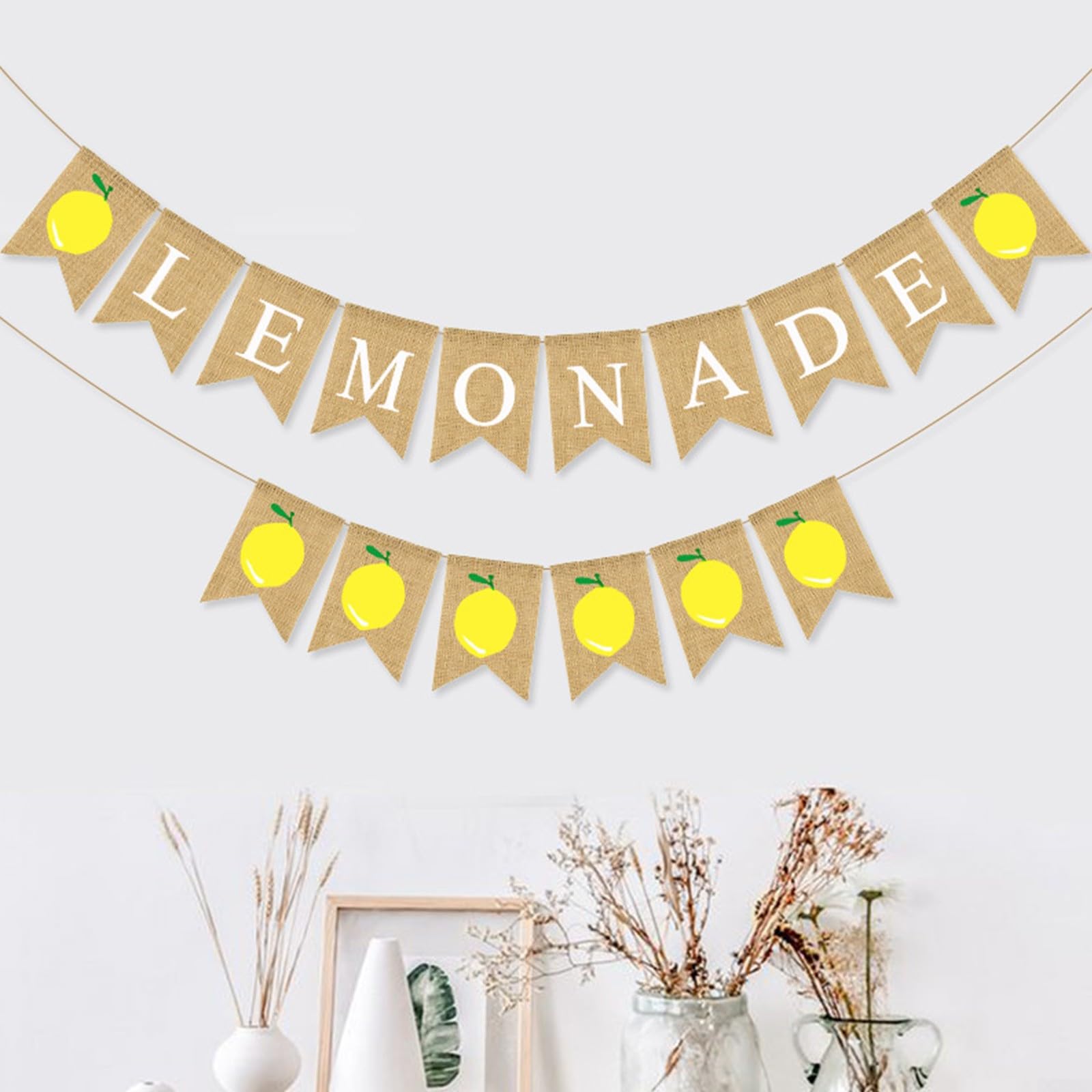 Sommer, Sonne, Limonadenstand! Dieses niedliche Banner aus natürlicher Jute macht jede Party perfekt. Mit 'Lemonade'-Aufschrift und Zitronen-Motiven. Jede Flagge 13x18 cm groß, schon fertig bespannt und montiert - in Minuten aufgehängt. Super für Geburtstage, Sommerfeste oder als Deko im Kinderzimmer. Drinnen und draußen einsetzbar, an Zweigen, Decken oder überm Kamin. Bringt sofort Urlaubsfeeling in dein Zuhause!