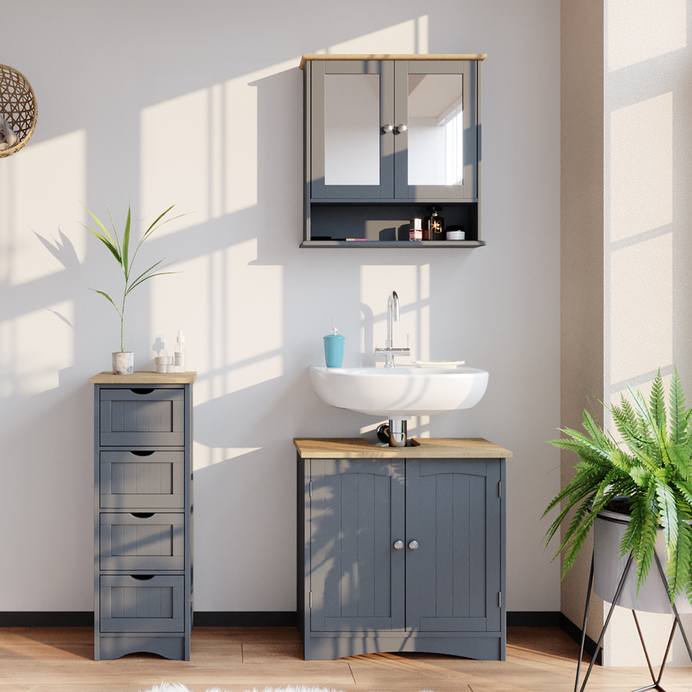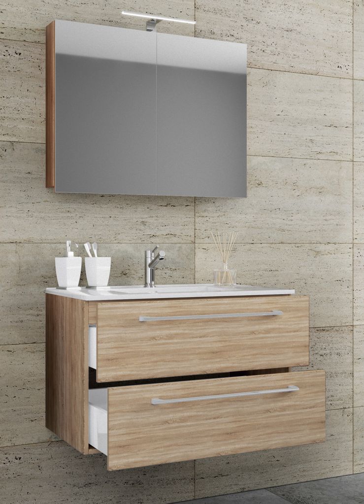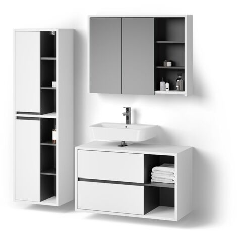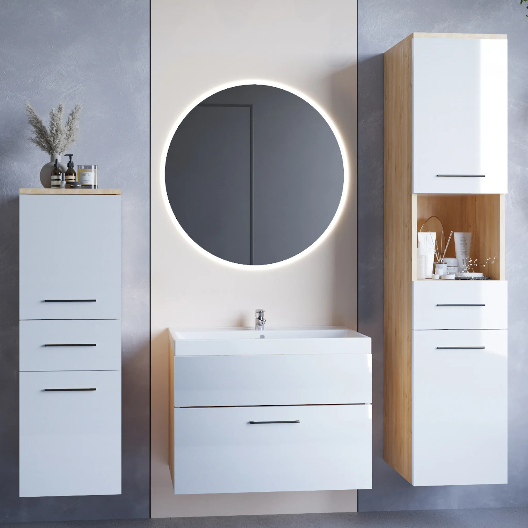 Endlich Ordnung im Bad! Dieses 3-teilige Badmöbel-Set in warmem Artisan-Eiche Look bringt Stil und Funktion perfekt unter einen Hut. Enthalten sind ein Spiegelschrank, ein Hochschrank und ein Waschbeckenunterschrank - also alles, was man für eine aufgeräumte Badezimmer-Atmosphäre braucht. Die wandmontierten Schränke sparen Platz und sehen dabei mega elegant aus. Mit vielen geschlossenen Fächern und großen Schubladen findet alles seinen Platz: Zahnpasta, Cremes, Handtücher - kein Chaos mehr! Hergestellt aus pflegeleichten 16-mm-Spanplatten mit Melaminharzbeschichtung. Einfach mit einem feuchten Tuch abwischen und schon sieht es wieder wie neu aus. Lieferung inklusive Montagematerial und Anleitung. Die Deko auf den Fotos ist natürlich nicht dabei - aber dafür habt ihr ja sicher selbst schon tolle Ideen!