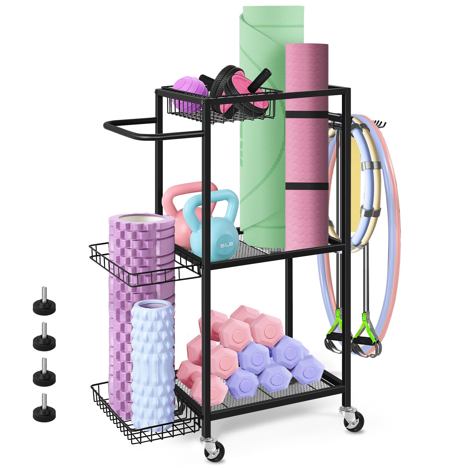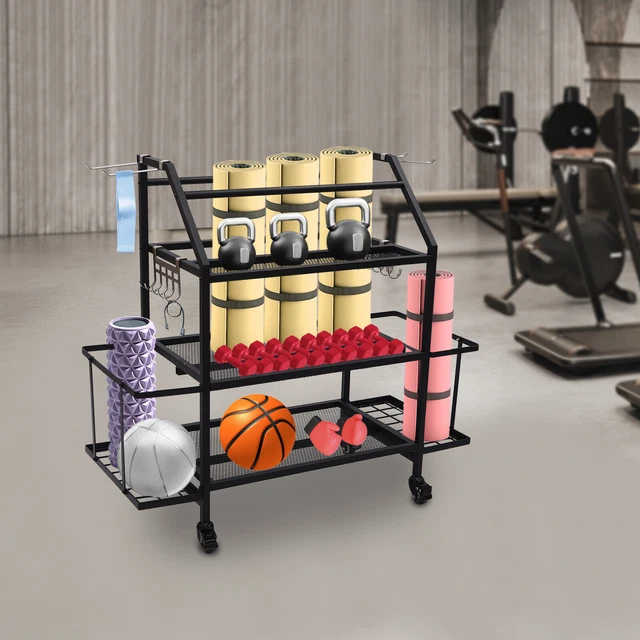 Endlich Ordnung im Home Gym! Dieses London & Byrd Fitness Regal ist der absolute Game-Changer für alle, die ihre Trainingsgeräte nicht mehr überall verstreut rumliegen haben wollen. Stell dir vor: Deine Yogamatten, Hanteln, Kettlebells und Resistance Bands haben alle ihren festen Platz - und das Regal ist sogar mobil! Mit den robusten Rädern (zwei davon feststellbar) schiebst du es einfach dahin, wo du trainieren willst. Das Beste: Die Montage ist super einfach. Du musst nur die Box öffnen, das Gestell entfalten, die obere Ablage befestigen und Räder sowie Zubehör anbringen - in 5-10 Minuten bist du fertig! Jedes Regal trägt bis zu 45,4 kg, also keine Sorge, dass es deine Hanteln nicht aushält. Der integrierte Seitenkorb bietet Platz für zwei dicke Yogamatten, und die verschiedenen Haken sind perfekt für Resistance Bands, Springseile und anderes Zubehör. Die Maße von 71,1 cm Breite x 91,4 cm Höhe x 30,5 cm Tiefe sind ideal für die meisten Home Gyms. Die Haltestangen sorgen dafür, dass nichts herunterfällt, wenn du das Regal bewegst. Egal ob in der Garage, im Wohnzimmer oder im Fitnessraum - dieses Regal bringt nicht nur Ordnung, sondern sieht auch noch richtig gut aus. Kein langes Suchen mehr nach dem passigen Trainingsgerät - alles ist griffbereit und organisiert. Dein Workout kann beginnen!
