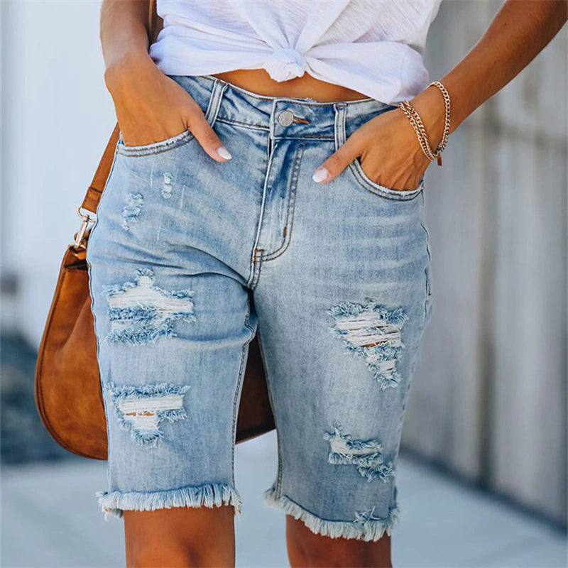 Hey, suchst du nach den perfekten Sommershorts? Diese Denim-Shorts im Used-Look sind genau das Richtige für heiße Tage! Mit mittelhoher Taille sitzen sie super bequem und betonen deine Figur auf lässige Art. Der zerrissene Look gibt ihnen diesen coolen, individuellen Charakter - kein Paar sieht genau gleich aus. Perfekt für Strandtage, Stadtbummel oder Festival-Besuche. Kombinierbar mit Tanktops, T-Shirts oder luftigen Blusen - total vielseitig! Der Denim-Stoff ist weich und angenehm auf der Haut, kein lästiges Einlaufen nötig. Egal ob mit Sneakern, Sandalen oder Boots - diese Shorts passen zu allem. Der Used-Look macht sie direkt wie deine Lieblingsshort, die du schon ewig hast. Einfach anziehen und sich wohlfühlen - mehr braucht's im Sommer manchmal nicht. Perfekt für alle, die es lässig und unkompliziert mögen. Ein Must-Have für jede Sommergarderobe!