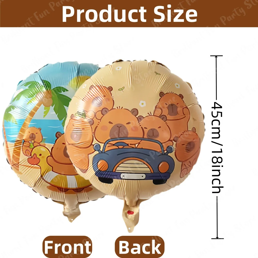 Wow, was für ein süßes Capybara Party-Set! Mit diesen 10 Teilen wird jede Geburtstagsfeier zum absoluten Highlight. Da ist wirklich alles dabei, was das Herz begehrt: Ein niedlicher Capybara Rucksack-Luftballon, ein sitzender Capybara-Luftballon, ein dreistöckiger Geburtstagstorten-Luftballon, ein Schildkröte Capybara Stirnband, ein Capybara Ente Handhalter, ein Capybara Apfel Handhalter und dazu noch 4 runde Capybara-Luftballons. Die Luftballons sind super praktisch - du kannst sie entweder mit ner Luftpumpe oder einfach mit dem Mund aufblasen, ganz wie du magst! Aus hochwertigem Aluminiumfolienmaterial gefertigt, sind sie nicht nur super stabil, sondern halten auch richtig lange. Du kannst die Deko-Teile ganz flexibel platzieren - ob an der Wand, an der Decke oder auf dem Tisch, deiner Kreativität sind keine Grenzen gesetzt! Perfekt für Geburtstagspartys, Kinderfeiern oder einfach mal so, um den Tag zu verschönern. Die fröhlichen Capybara-Motive bringen einfach sofort gute Laune! Egal ob kleine Familienfeier oder große Party - mit diesem Set machst du alles bunter und lustiger. Deine Gäste werden begeistert sein und die Feier bleibt garantiert in bester Erinnerung! Einfach auspacken, aufblasen und die Party kann starten!