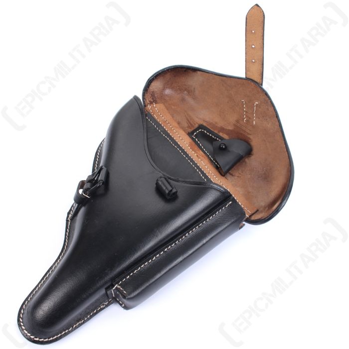 Alter, dieses Luger P08 Holster von WARCRAFT EXPORTS ist ein echter Hingucker für Sammler und Reenactor! Aus weichem, geschmeidigem Leder gefertigt, ist es eine detailgetreue Reproduktion des originalen WWII German Military Holsters. Auf der Rückseite ist es authentisch mit \P08\ markiert - genau wie das historische Vorbild. Das Hartschalen-Design schützt die Pistole optimal und die seitliche Tasche bietet Platz für ein Ersatzmagazin. Das Leder ist super verarbeitet ohne Risse oder Löcher, alle Nähte sind sauber und fest. Perfekt für Sammler, die ihre Luger P08 originalgetreu präsentieren wollen, oder für Reenactment-Veranstaltungen. Das schwarze Leder sieht einfach klasse aus und entwickelt mit der Zeit eine schöne Patina. Ein qualitativ hochwertiges Stück Zeitgeschichte, das jeden Waffenschrank aufwertet. Einfach die Pistole einlegen und sich wie in einer anderen Zeit fühlen!