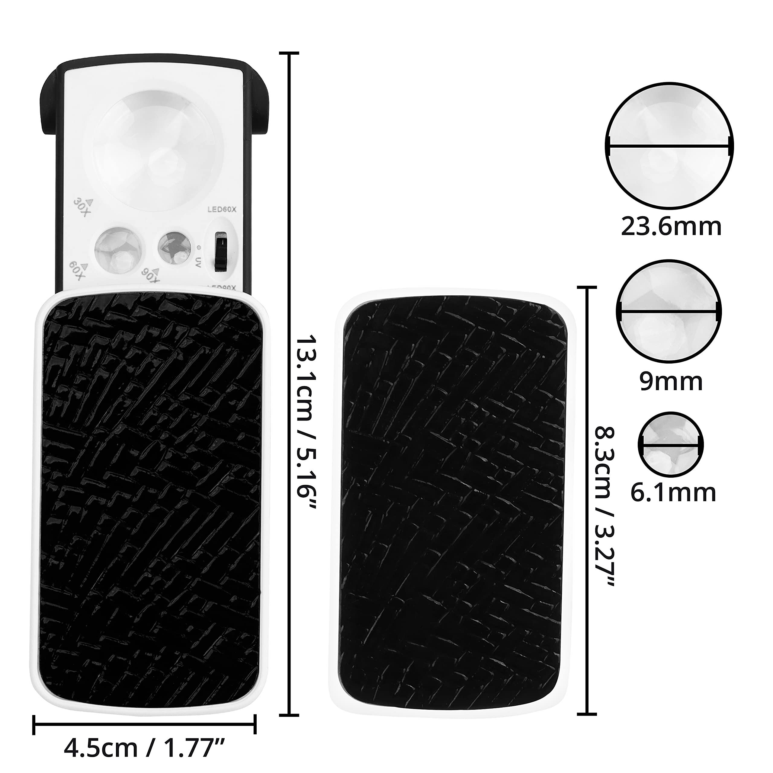 Alles genau unter die Lupe nehmen! Diese praktische 10-fache Vergrößerungslinse aus optischem Glas liefert gestochen scharfe Bilder. Mit 8 LED-Lichtern für perfekte Ausleuchtung auch bei dunklen Bedingungen. Die integrierte Maß- und Winkelskala ermöglicht präzise Messungen. Verstellbare Brennweite für individuellen Vergrößerungseffekt. Perfekt für Juweliere, Briefmarkensammler, Münzprüfer oder Modellbauer. Wird mit einer schicken PU-Leder Aufbewahrungstasche geliefert. Benötigt 4x AG9 Knopfbatterien (nicht im Lieferumfang). Ein unverzichtbares Werkzeug für alle, die Wert auf Genauigkeit und Detailtreue legen. Ob zur Qualitätskontrolle, für Reparaturen oder einfach zum Entdecken der kleinen Wunder des Alltags - diese Lupe ist dein treuer Begleiter.