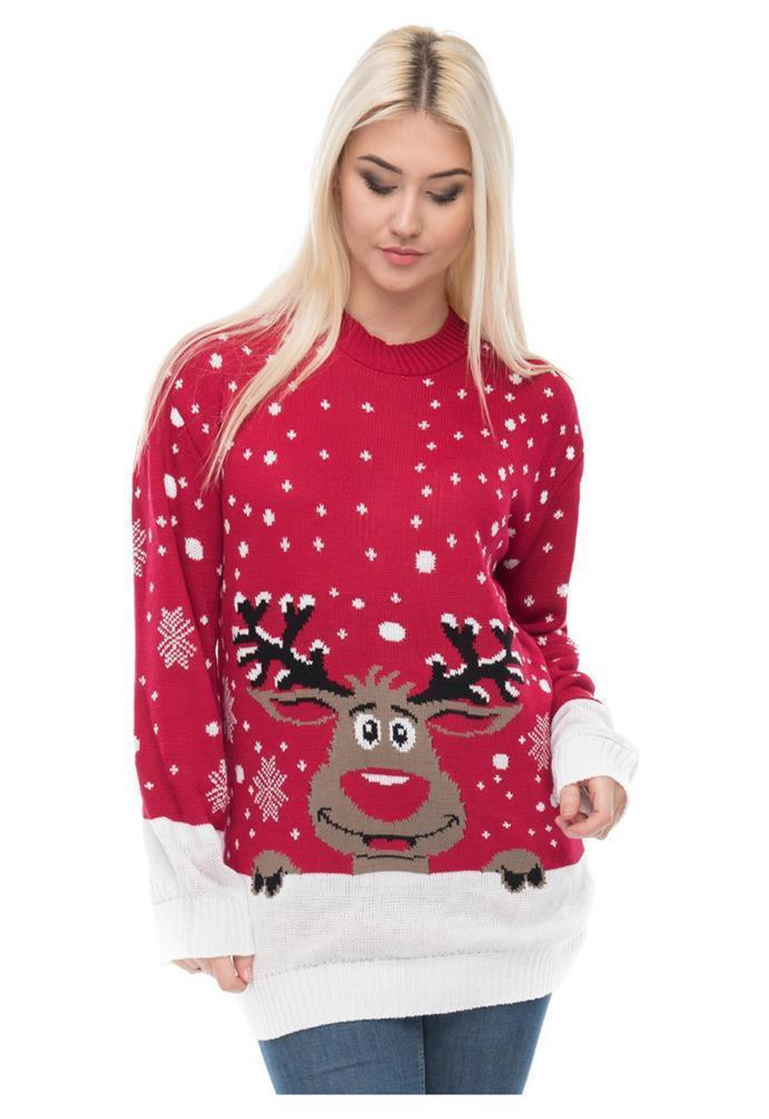 Perfekt für die Weihnachtszeit! Dieser lustige Weihnachtspullover mit niedlichem Rudolph Rentier Design bringt sofort Festtagsstimmung. \\n\\nAus weichem Baumwollmix gefertigt, kratzt er nicht und fühlt sich angenehm auf der Haut an. Der dehnbare Stoff bietet perfekte Passform und Bewegungsfreiheit. \\n\\nIdeal für: \\n• Weihnachtsfeiern \\n• Gemütliche Adventsabende \\n• Weihnachtsmarkt-Besuche \\n• Familienfotos \\n• Ugly Christmas Sweater Parties \\n\\nDer moderne Schnitt betont die feminine Silhouette, ohne zu eng zu sein. Perfekt kombinierbar mit Jeans, Leggings oder weihnachtlichen Röcken. \\n\\nMach deine Weihnachtsfeier unvergesslich - mit diesem eye-catching Pullover bist du garantiert der Star der Party!