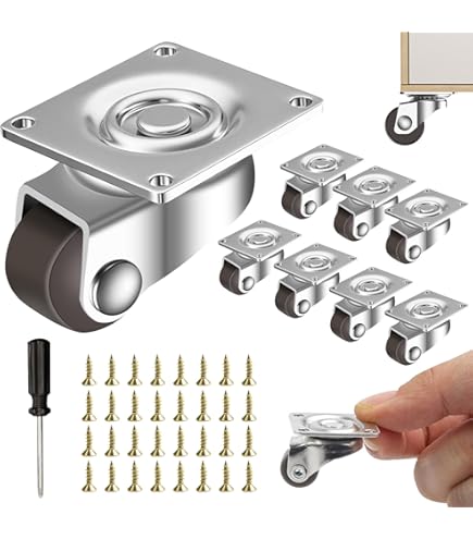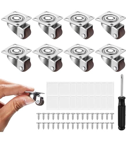 Mach deine Möbel mobil! Diese 8 kleinen Möbelrollen verwandeln feststehende Möbel in flexible Begleiter. Jedes Rad trägt bis zu 10kg, insgesamt also 80kg! Aus Metall und Kunststoff gefertigt, sind sie verschleißfest und schonen deine Böden. Das 360°-Schwenklager sorgt für müheloses Manövrieren in alle Richtungen - absolut geräuschlos! Du kannst zwischen Schraub- oder Klebemontage wählen - beide Varianten sind im Lieferumfang enthalten: 32 Befestigungsschrauben, 8 Klebeaufkleber und sogar ein schwarzer Schraubendreher. Mit den Maßen 2,65x2,25cm (Radbreite 0,95cm) passen sie perfekt unter Werkbänke, Couchtische, Schränke, Pflanzenständer, Bücherregale und mehr. Stell dir vor: Du kannst schwere Möbel einfach zur Seite schieben fürs Putzen oder Umstellen! Perfekt für Zuhause, Lager, Geschäft, Restaurant, Schule oder Krankenhaus. Einfach montieren und sofort mehr Flexibilität genießen. Hol dir dieses praktische Set und mach dein Zuhause beweglicher!