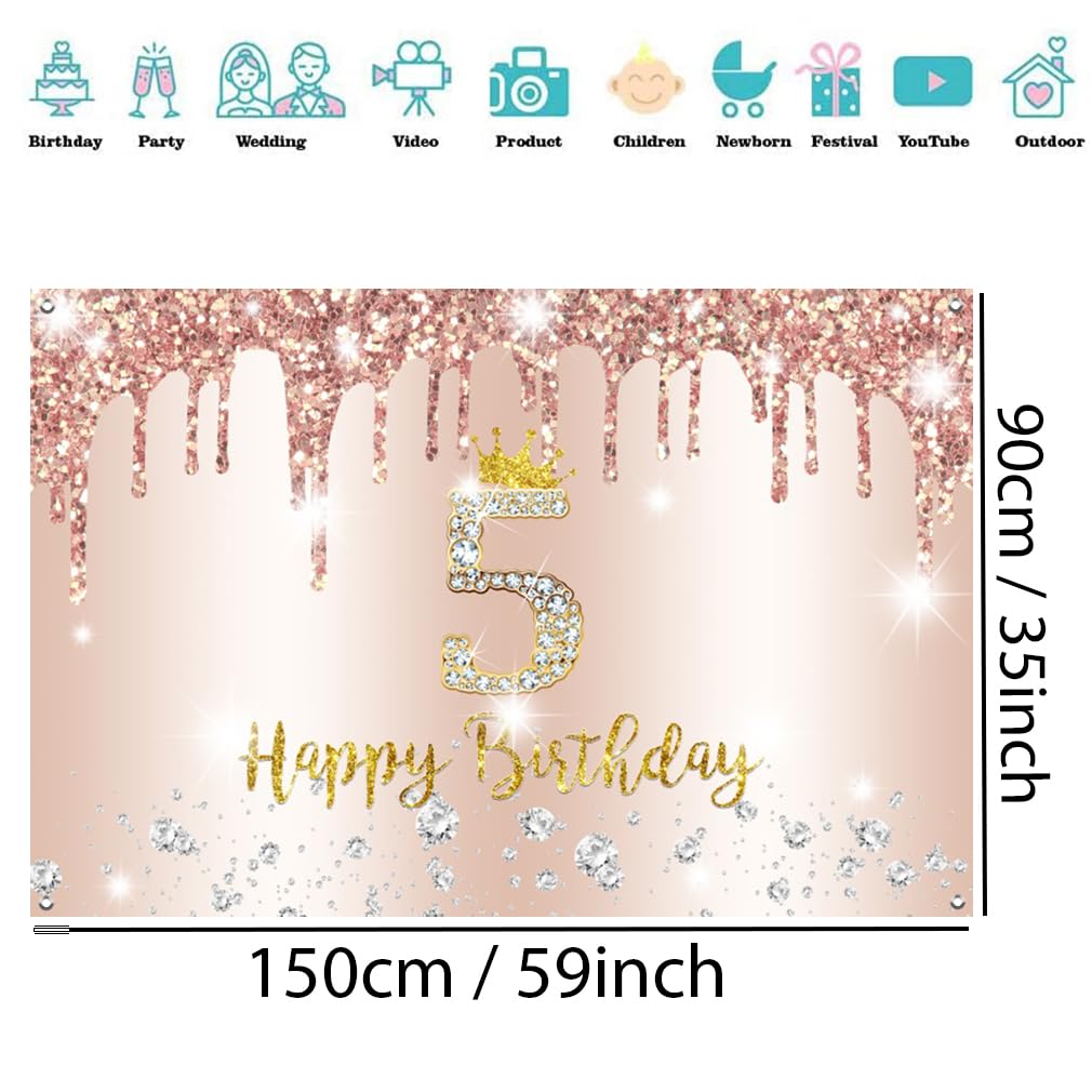 Alles Gute zum 5. Geburtstag! Dieses wunderschöne Stoff-Banner verwandelt jede Feier in ein magisches Ereignis. Mit 150x90 cm Maßen ist es der perfekte Hintergrund für deine Geburtstagsfotos. Das elegante Design mit Blumen-Elementen begeistert jedes Mädchen. Aus reißfestem Vinyl mit hochauflösendem Digitaldruck in lebendigen Farben. Einfach aufzuhängen mit den 4 Kupferösen (Seil nicht inklusive) oder mit Klebeband an Wand/Fenster befestigen. Perfekt für drinnen und draußen - ob als Willkommensschild, Tischdekoration oder Party-Hintergrund. Mach den besonderen Tag deiner Kleinen unvergesslich! Ein Geschenk, das garantiert für strahlende Augen sorgt und auf allen Fotos toll aussieht.
