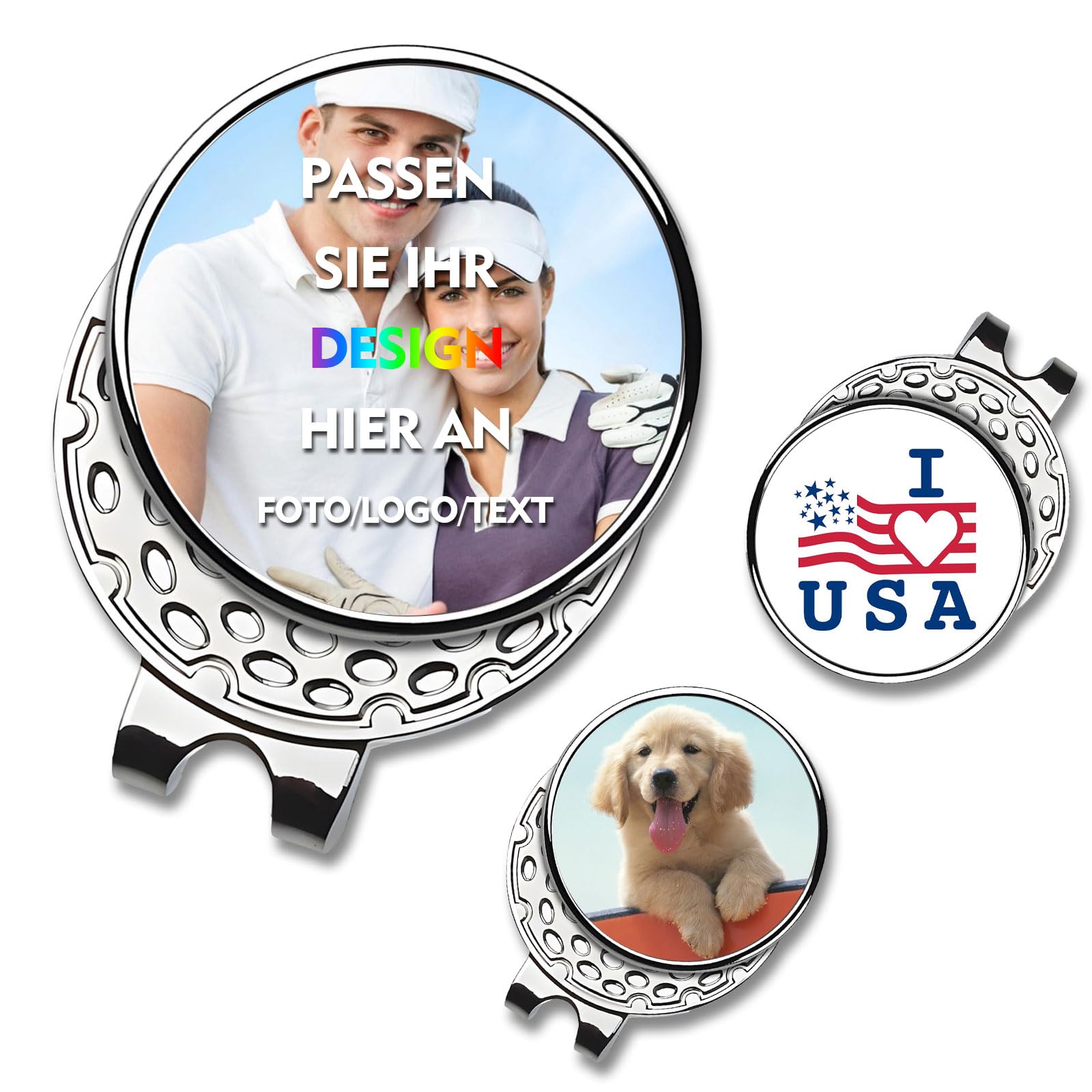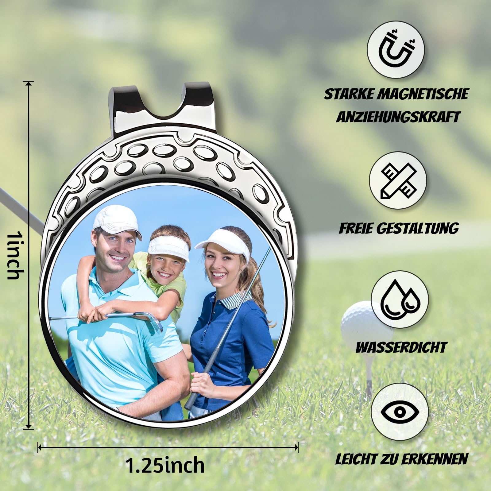 Der individuellste Golf-Clip für deine Kappe! Dieser personalisierte Golfballmarker lässt sich mit deinem Foto, Namen, Text oder Logo gestalten - einfach 'Jetzt anpassen' klicken. Mit starkem Magneten, der den Ballmarker sicher hält. Aus hochwertigem vernickeltem Metall, korrosionsbeständig und langlebig. Maße: 2,5x3,2cm - passt auf jede Baseballkappe. Einfach an der Krempe befestigen und der Marker ist immer griffbereit. Perfekt als Geschenk für Golfer, Väter oder Golf-Liebhaber zu Geburtstag, Weihnachten oder Vatertag. Auch ideal für Golf-Teams oder Turniere. Vereinigt Funktionalität mit persönlichem Style. Macht jedes Golf-Outfit komplett und ist immer ein Gesprächsstarter auf dem Golfplatz!