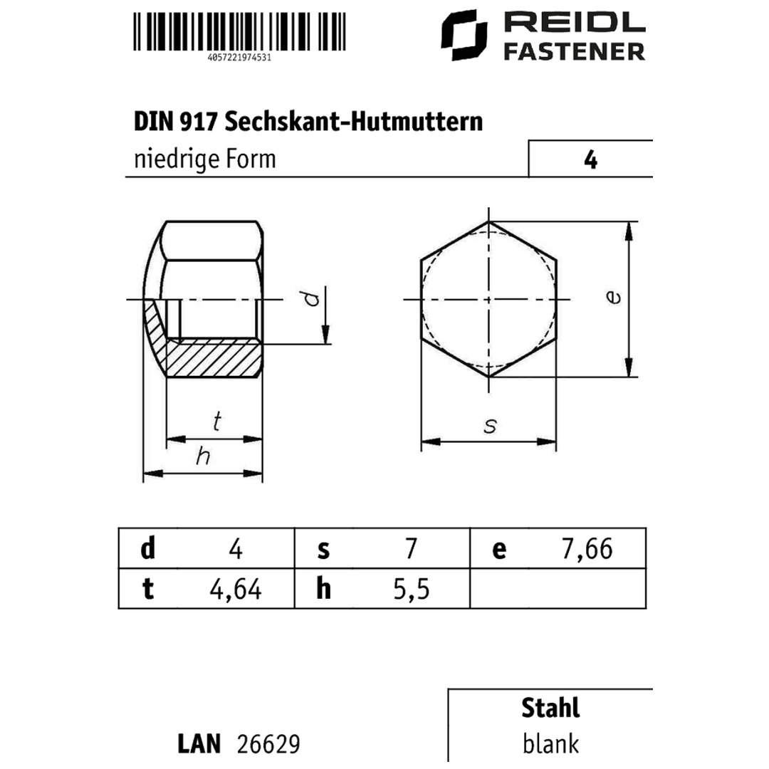 Mit metrischem Regelgewinde und Außensechskant für einfache Montage mit herkömmlichen Schraubenschlüsseln. Die niedrige Form nach DIN 917 ist platzsparend und vielseitig einsetzbar.