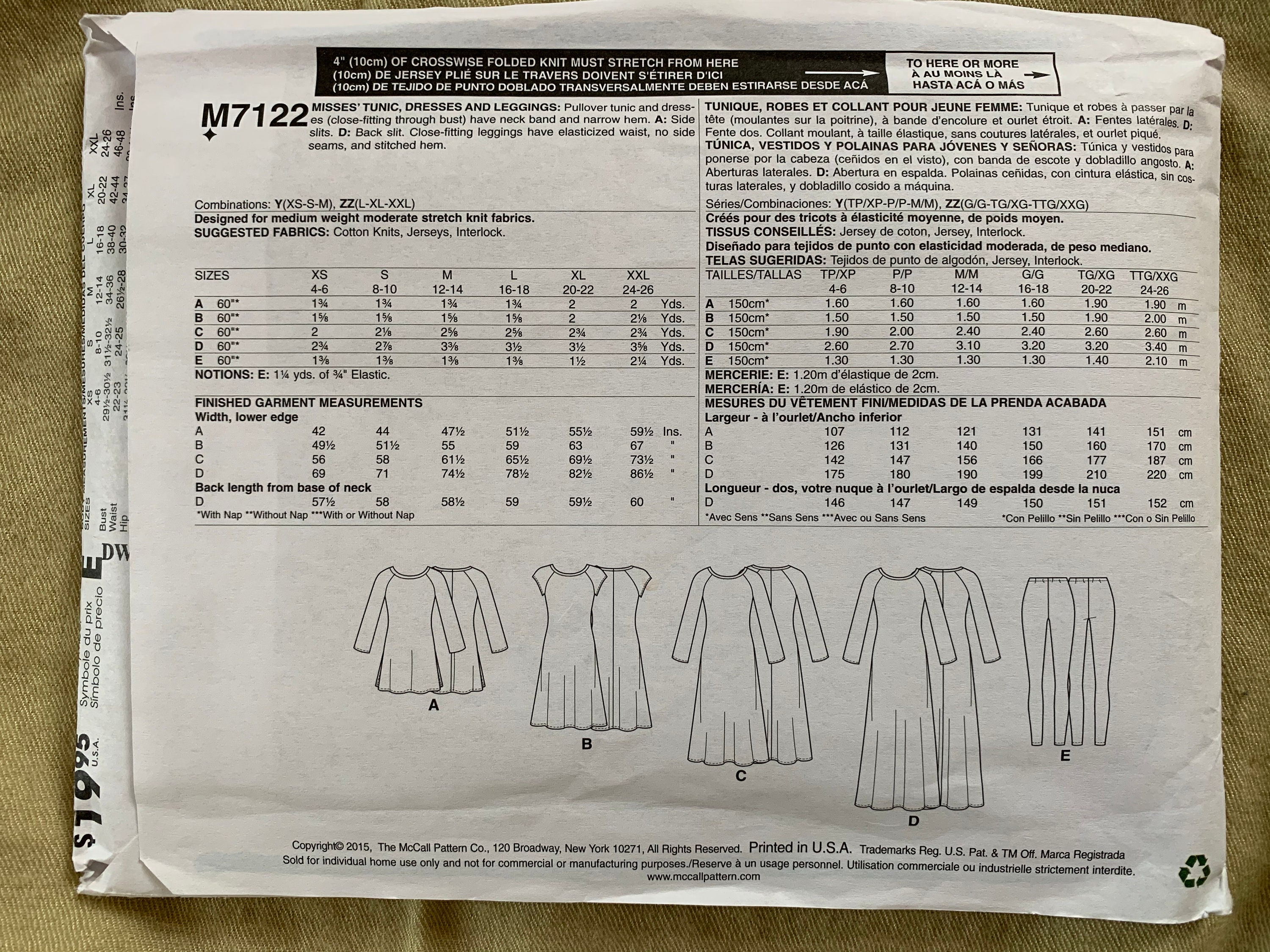 Nähbegeisterte aufgepasst! Dieses McCalls Schnittmuster M7122 ist perfekt für alle, die gerne modische Tuniken, Kleider und Leggings nähen. Das Mehrgrößen-Schnittmuster enthält die Größen Large, X-Large und XX-Large - maximal drei Größen in einem Schnitt, kein mühsames Kopieren nötig! Die Nahtzugabe von 1,5cm ist bereits enthalten. Die Anleitung gibt's auf Deutsch und Englisch. Die Tuniken und Kleider haben einen Nackenband und schmalen Saum, teilweise mit Seitenschlitzen oder Rückenschlitz. Die Leggings haben einen elastischen Bund und keine Seitennähte. Designed für mittelschwere, moderate Stretch-Strickwaren wie Baumwollstrick, Jerseys oder Interlock. Ob mit oder ohne Nickerchen - hier ist für jeden Style was dabei. Die durchdachten und bewährten Schnitt-Techniken garantieren eine perfekte Passform. Einfach Stoff aussuchen, Schnittmuster rauslegen und losnähen! So kreierst du dir deine individuelle Garderobe.