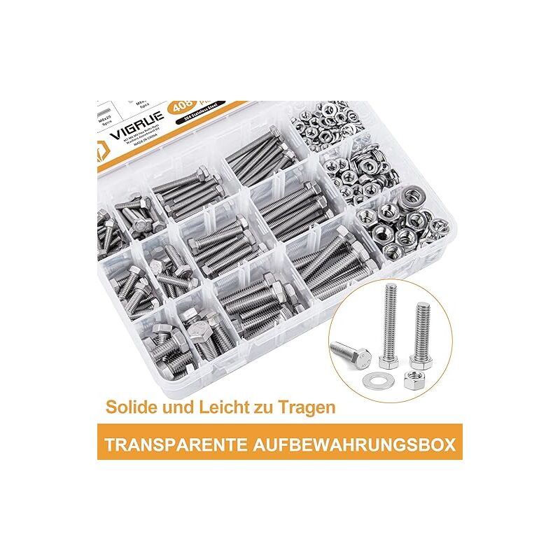 Wow, dieses Schrauben-Set ist echt praktisch! Enthält alles was du brauchst: 106 Sechskantschrauben, 106 Muttern, 121 Unterlegscheiben und 121 Sicherungsringe in den Größen M5, M6 und M8. Aus hochwertigem 304 Edelstahl gefertigt - das bedeutet die Teile sind super korrosionsbeständig und halten ewig, selbst bei Feuchtigkeit oder im Außenbereich. Die Gewinde sind sauber gearbeitet und passen perfekt zu den Muttern. Das sechseckige Design macht das Anziehen und Lösen total einfach. Und das Beste: Alles kommt in einer praktischen Aufbewahrungsbox mit klaren Fächern, damit du nie wieder ewig nach der richtigen Schraube suchen musst. Perfekt für alle möglichen Reparaturen zu Hause, Maschinenwartung oder DIY-Projekte. Ein echter Allrounder für jede Werkstatt!