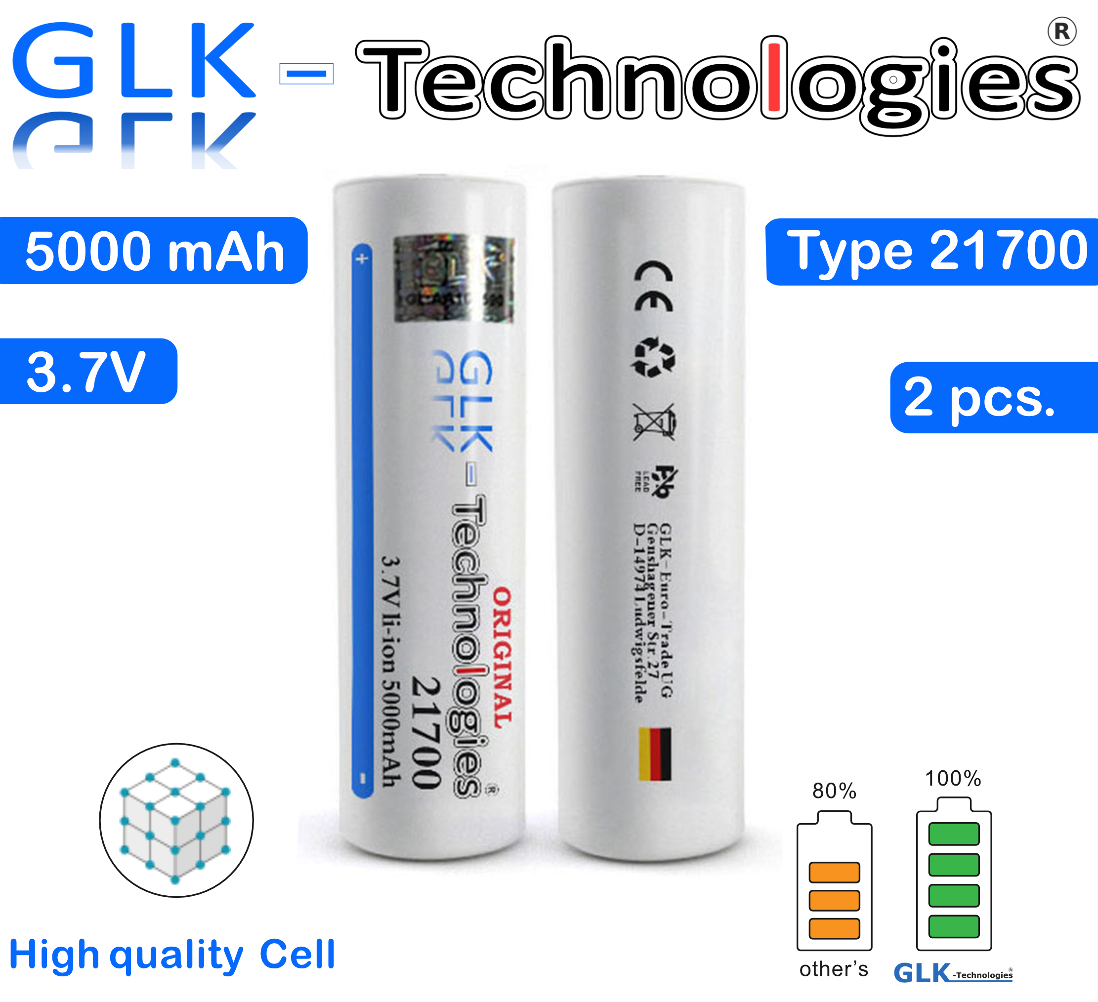 Nie wieder Stromausfall! Dieser GLK-Technologies Akku mit satten 5000 mAh hält ewig. Bei 3,7V liefert er konstante Power für Taschenlampen, Kameras, Spielzeug und mehr. Wiederaufladbar und umweltfreundlich - spart Geld und Müll im Vergleich zu Wegwerf-Batterien. Mit geringer Selbstentladung bleibt der Akku lange geladen. Temperaturbeständig und sicher mit Überladungsschutz. Maße: 21x72mm - passt perfekt in portable Geräte. Ideal für Outdoor-Abenteuer oder den täglichen Einsatz. Zwei hochwertige Akkus im Set - doppelte Power für deine Geräte!