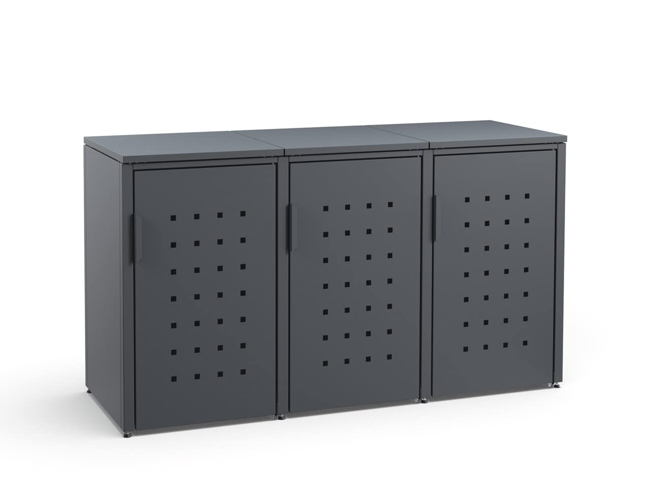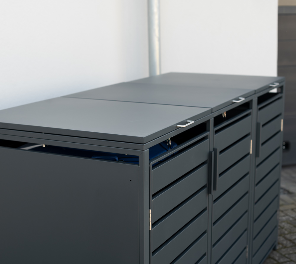 Diese MEISTERBOX macht deine Mülltonnen unsichtbar! Für drei 240L Tonnen - perfekt für die moderne Mülltrennung. Mit praktischem Klappdach aus feuerverzinktem Stahl. In Anthrazit sieht sie einfach edel aus. Made in Germany - langlebig und wetterfest. Als Bausatz geliefert, einfach selbst montieren. Schützt vor Wind, Wetter und neugierigen Blicken. Die dekorative Quadratlochung gibt ihr ein modernes Design. Mach deinen Vorgarten zur Wohlfühloase - ohne Mülltonnen-Blickfang!