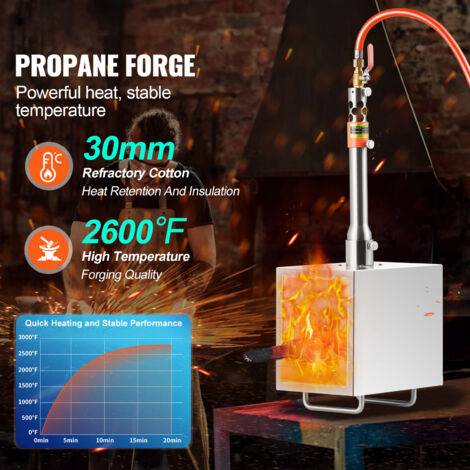 Perfekte Schmiede für Einsteiger und Profis! Diese Propan-Schmiede mit einem Brenner heizt schnell auf und erreicht hohe Temperaturen für Damaststahl und Schmiedewerkzeuge. Mit praktischer Tür die du öffnen oder schließen kannst - im geschlossenen Zustand heizt sie noch schneller. Innenmaße 27,9x15,2x8,4 cm, perfekt für Messer und kleinere Projekte. 2,5 cm Isolierung plus Schamottstein für optimale Wärmehaltung. Einfach Brenner und Gasschlauch anschließen und los geht's! Mit tragbarem Griff für einfachen Transport.