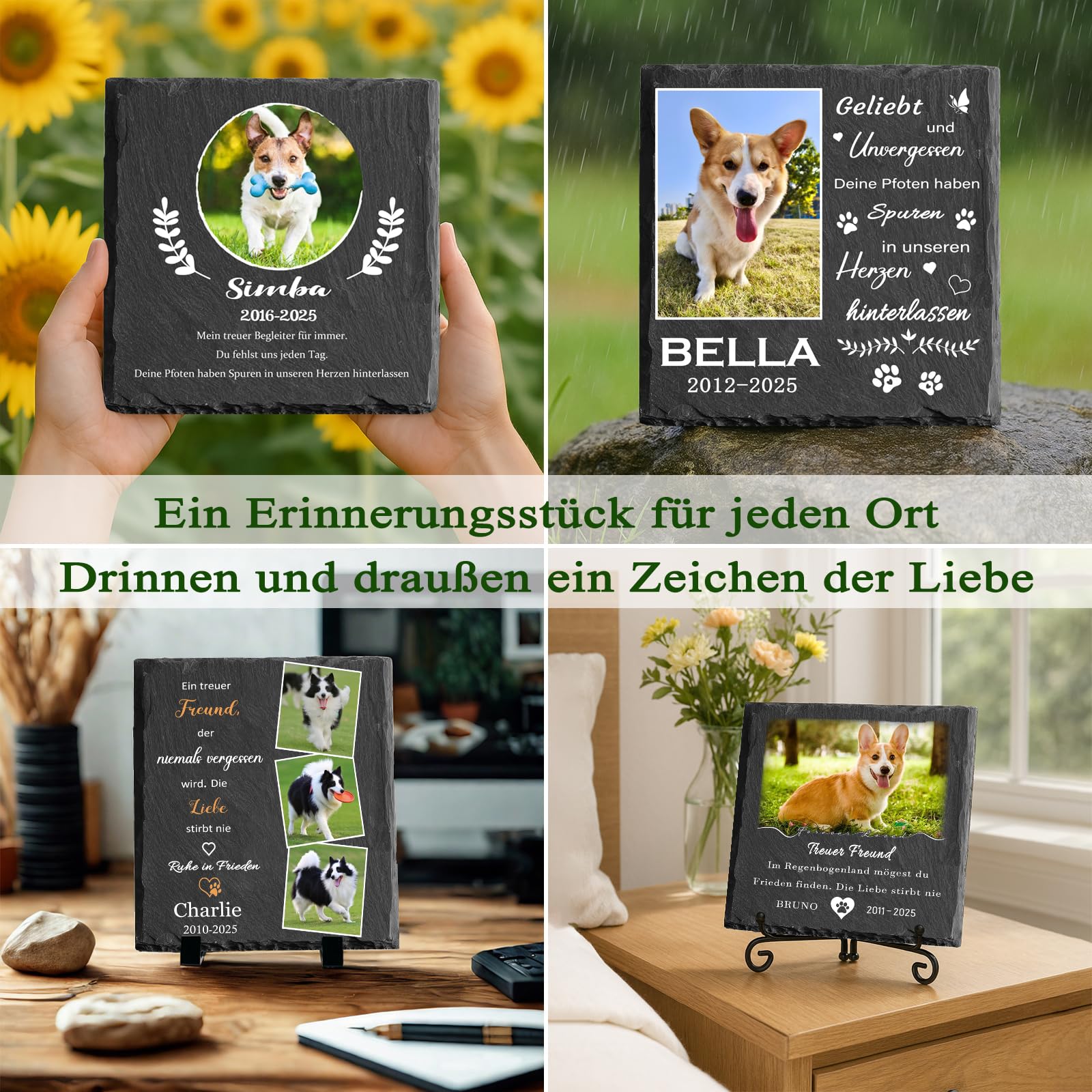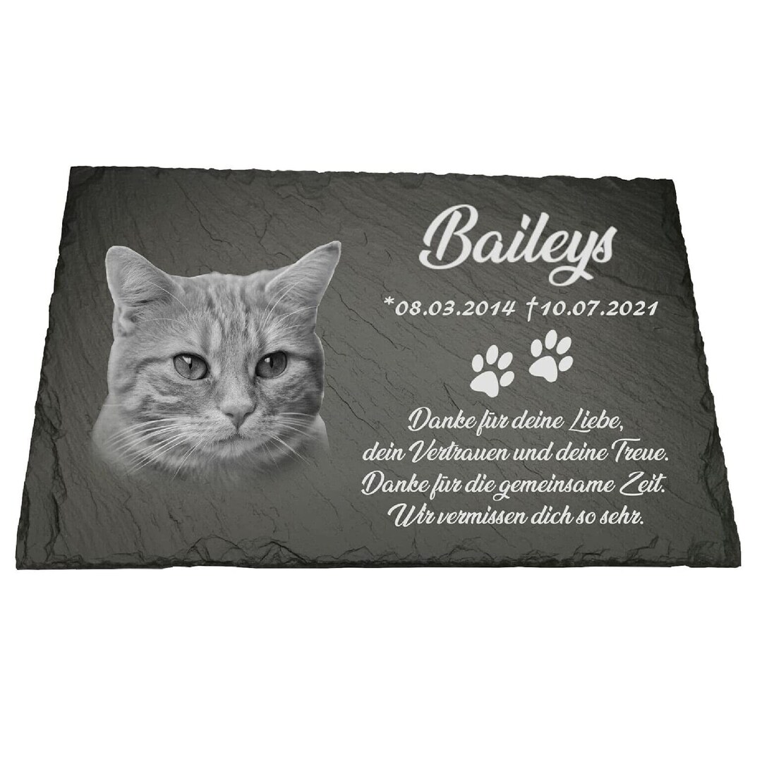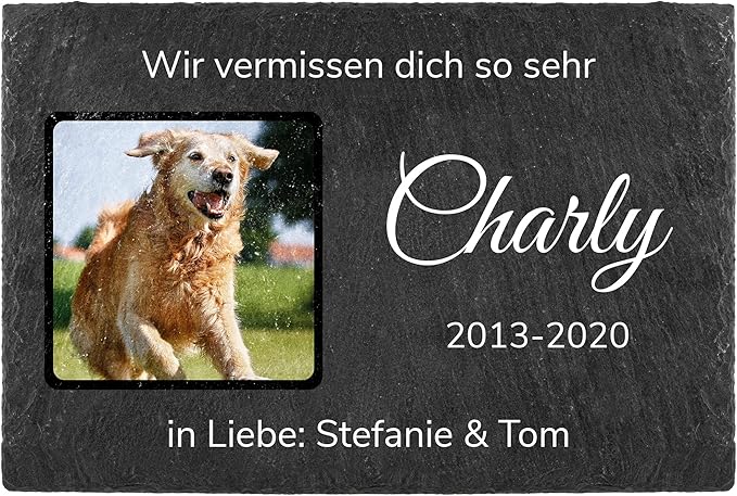 Für alle, die Abschied von einem geliebten Haustier nehmen müssen - dieser personalisierte Tiergrabstein gibt der Erinnerung einen würdigen Platz. Aus echtem Naturstein handgefertigt, mit einzigartiger Maserung und gebrochener Kante für einen ganz besonderen Charakter. Du kannst den Stein komplett individuell gestalten: mit dem Namen deines Tieres, den Lebensdaten, einer persönlichen Botschaft und sogar einem Foto. Egal ob Hund, Katze, Kaninchen oder Vogel - jedes Tier verdient ein bleibendes Andenken. Wähle aus vier verschiedenen Formen: Herzform für tiefste Verbundenheit, runde Form für den ewigen Kreislauf des Lebens, quadratische Form für ein harmonisches Andenken oder rechteckige Form für längere Widmungen. Der Stein wird mit einem Kunststoffständer geliefert, optional gibt's einen eleganten Eisenständer. Wetterfest für Garten und Draußen, aber auch für innen geeignet. Einfach online gestalten - Foto hochladen (mindestens 1000x1000 Pixel), Text eingeben und das Layout anpassen. Ein tröstliches und bleibendes Andenken, das die besondere Bindung zu deinem tierischen Freund für immer festhält.