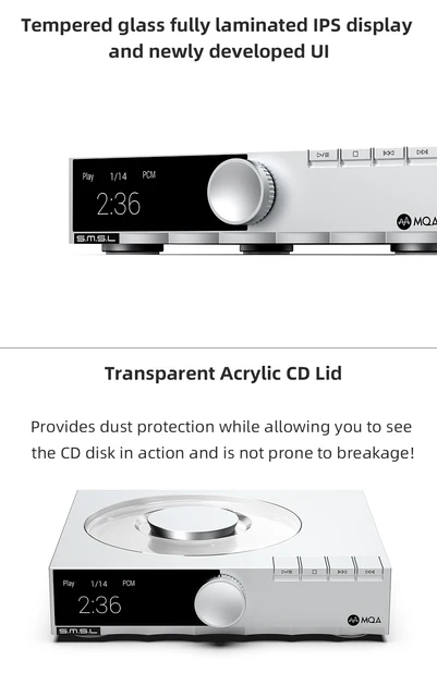Wow, dieser SMSL PL200T CD-Spieler bringt deine Musik auf das nächste Level! Als High-End CD-Transport unterstützt er MQA-CDs mit 8-facher Entfaltung bis 384kHz. Mit dem eigenen P.A.S.S. Servo-System liest er CDs laserpräzise und schnell. Neben CDs kannst du auch über USB (bis 32Bit/768kHz DSD512) oder Worttakteingang (44,1kHz oder 10MHz) Musik abspielen. Die Ausgänge bieten alles: Optisch, Koaxial, AES/EBU und I2S. Das transparente Acryl-Cover schützt vor Staub und lässt dich die CD drehen sehen. Verpackt in einem CNC-gefrästen Aluminium-Chassis mit vergoldeten Anschlüssen und schlankem 42mm Profil. Inklusive Fernbedienung für bequeme Steuerung. Ob für klassische CDs oder High-Res Audio - dieser Player macht alles mit. Ein Traum für jeden Audiophilen!
