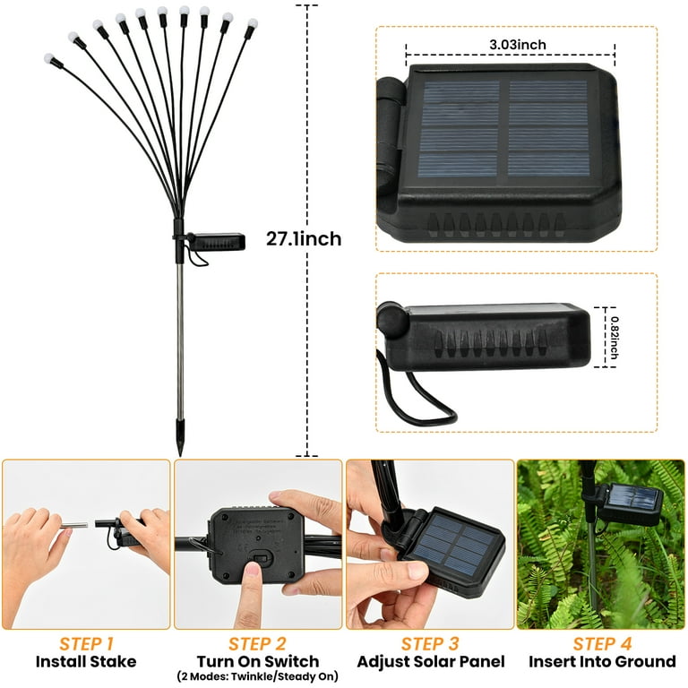 Verwandle deinen Garten in eine magische Lichtshow! Diese 4 Solarleuchten im Glühwürmchen-Design tanzen im Wind und sorgen für eine richtig märchenhafte Stimmung. Jede Leuchte hat 10 superhelle LEDs, die sich tagsüber automatisch aufladen und abends in warmem Weiß leuchten. Dank IP65 Schutz sind sie komplett wetterfest - egal ob Regen, Schnee oder Sonnenschein! Einfach in die Erde stecken, Schalter umlegen und fertig ist die Gartenbeleuchtung. Die flexiblen Stängel wiegen sich sanft im Wind, genau wie echte Glühwürmchen. Perfekt für Wege, Beete oder die Terrasse. Mit dem großen 600mAh Akku leuchten sie bis zu 8 Stunden! Wichtig: Regelmäßig das Solarpanel säubern für maximale Leistung.