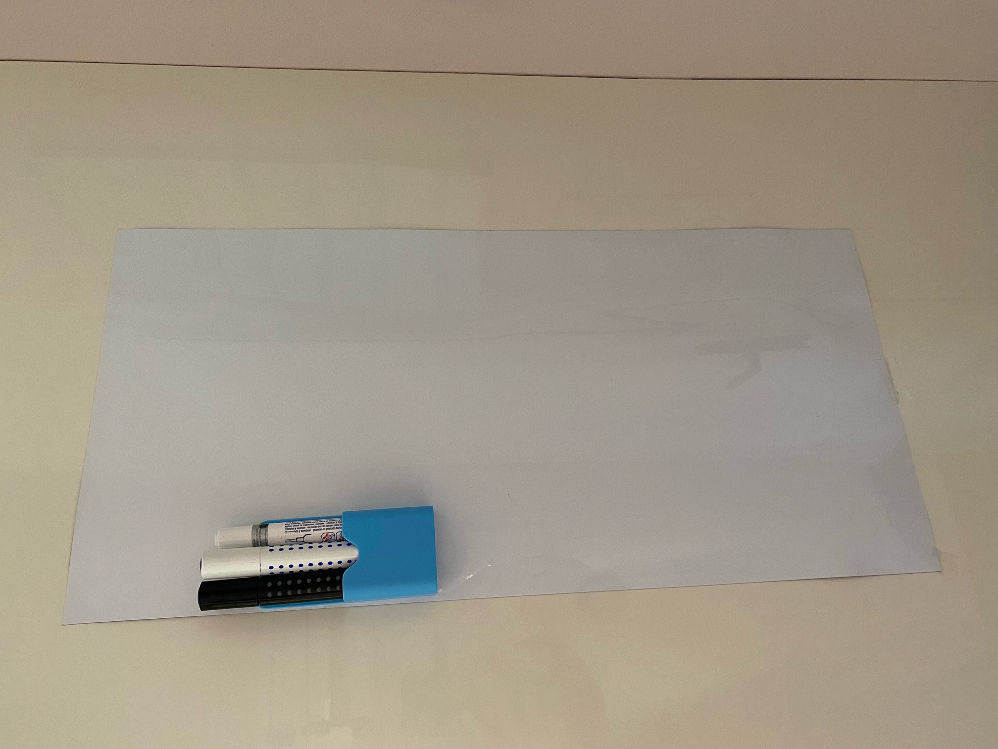 Im Lieferumfang ist sogar ein Kreidestift und 10 Magnete dabei - alles sofort startbereit. Einfach die Schutzfolie abziehen, auf eine glatte Oberfläche kleben und schon kann's losgehen. Die Oberfläche lässt sich trocken abwischen und hinterlässt keine Geisterschrift.