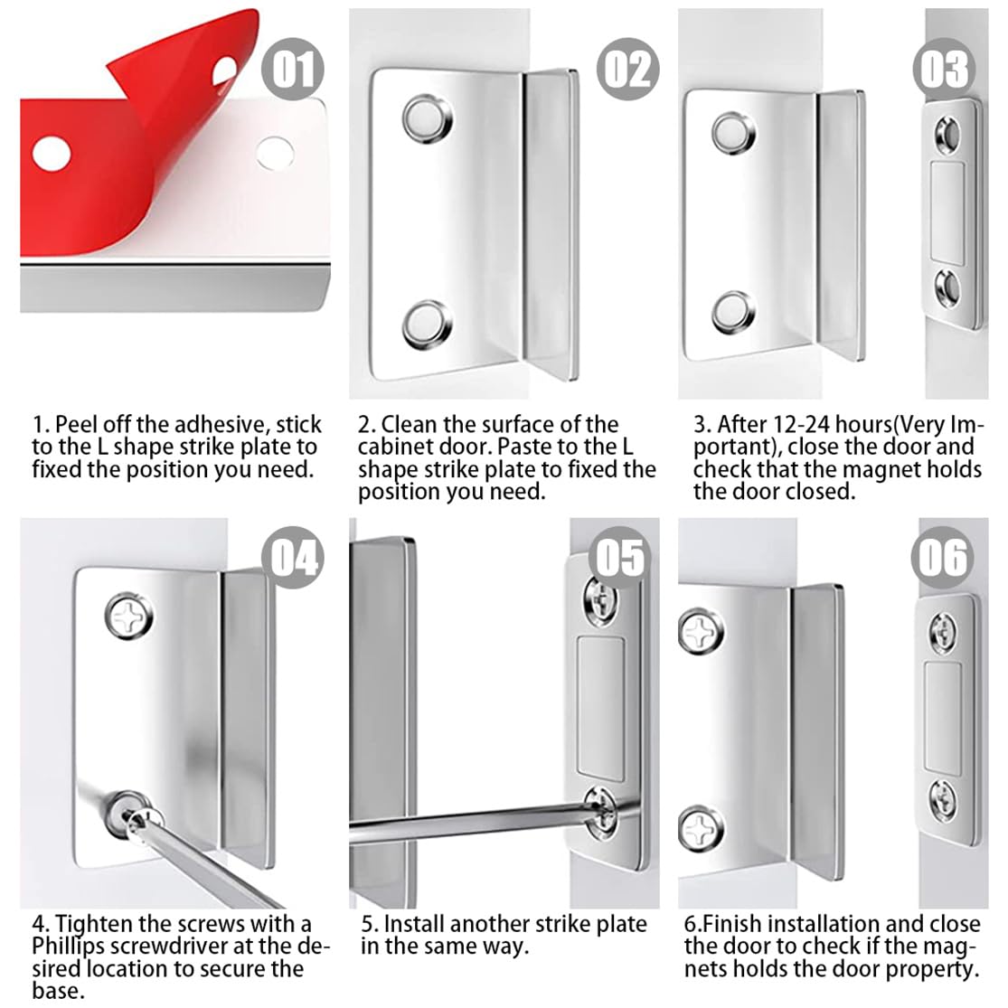 Endlich haben lästige Schranktüren, die nicht zu bleiben, ein Ende! Dieses praktische Magnetschnäpper-Set bringt Ordnung in deine Möbel.\\n\\nWas im Set enthalten ist:\\n• 15x L-förmige Magnetschnäpper\\n• 60x Schrauben für feste Montage\\n• 1x Schraubendreher - alles dabei\\n• Selbstklebende Option - keine Bohrer nötig\\n• Farbe: Silber - passt zu den meisten Möbeln\\n\\nTechnische Details:\\n• Größe: 3,7x1,6x2,4cm - kompakt und unauffällig\\n• Material: Kaltgewalzter Stahl - rostfrei\\n• Starker Magnet - hält sicher zu\\n• L-Form - für enge Bereiche ideal\\n• Beidseitig montierbar - maximale Flexibilität\\n\\nZwei Montage-Möglichkeiten:\\n• Schrauben: Super fest und dauerhaft\\n• Selbstklebend: Schnell und ohne Werkzeug\\n\\nEinsatzorte ohne Ende:\\n• Kleiderschränke und Kommoden\\n• Küchenschränke und Schubladen\\n• Regentüren und Schiebetüren\\n• Vitrinen und Sideboards\\n• Kühlschränke und Gefriertruhen\\n\\nDer Magnet ist überraschend stark! Selbst schwere Türen bleiben zuverlässig geschlossen. Die L-Form sorgt dafür, dass kaum ein Spalt zwischen Tür und Rahmen entsteht - sauber und professionell.\\n\\nPerfekt für:\\n• Nachrüsten von Billigmöbeln\\n• Reparatur von alten Möbeln\\n• Ordnungssysteme einrichten\\n• Kinderzimmer sicher machen\\n• Allgemeine Haushaltsorganisation\\n\\nEin kleines Teil mit großer Wirkung - bestell das Set und bring deine Möbel in Ordnung!